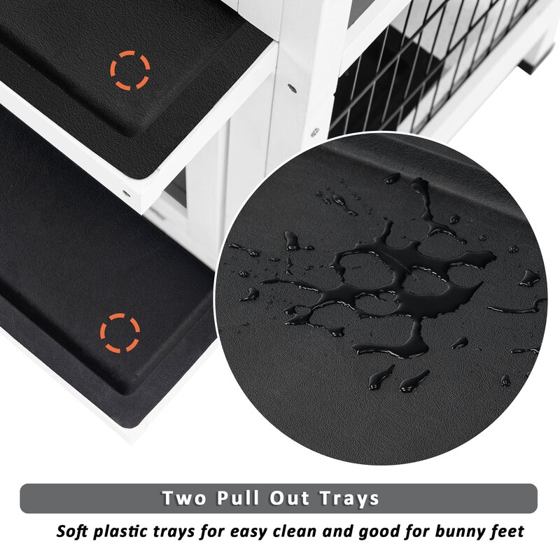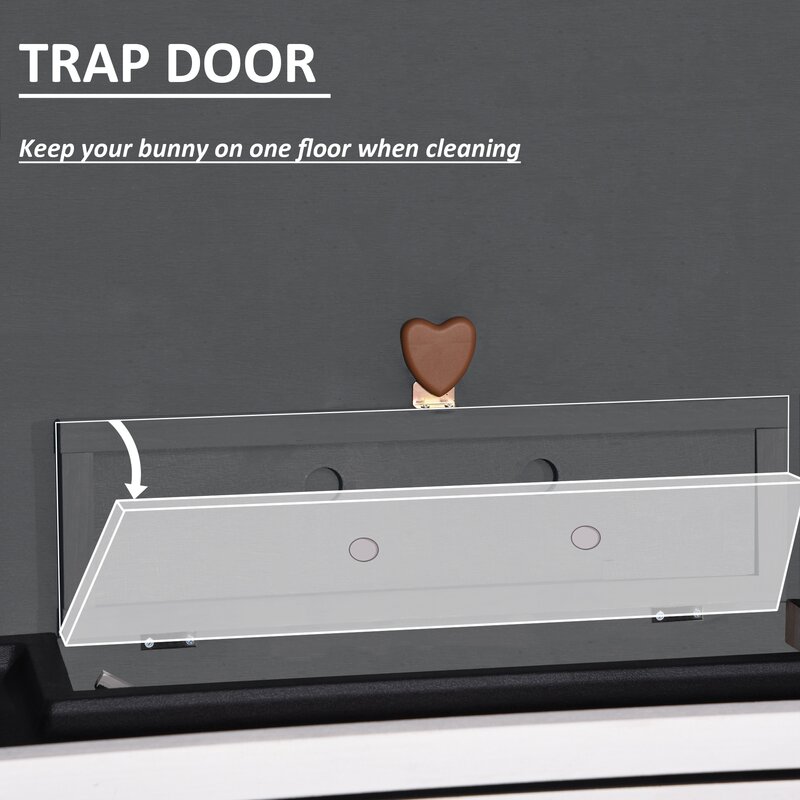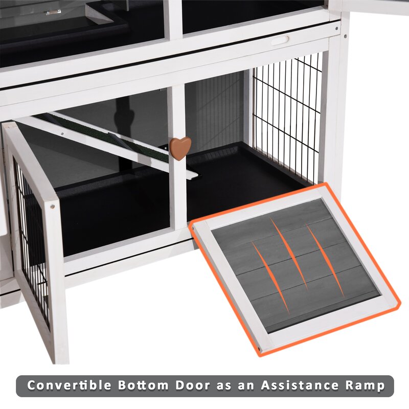 An easy-to-clean removable sliding pan in PVC plastic covers more than half of the upper level. A solid front door near the sleeping quarters locks securely with a metal slide bolt, along with an additional wire door upstairs and a wire and wood door below