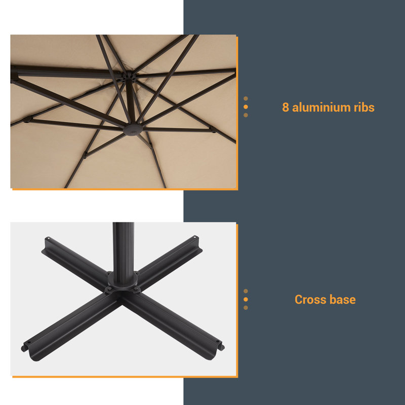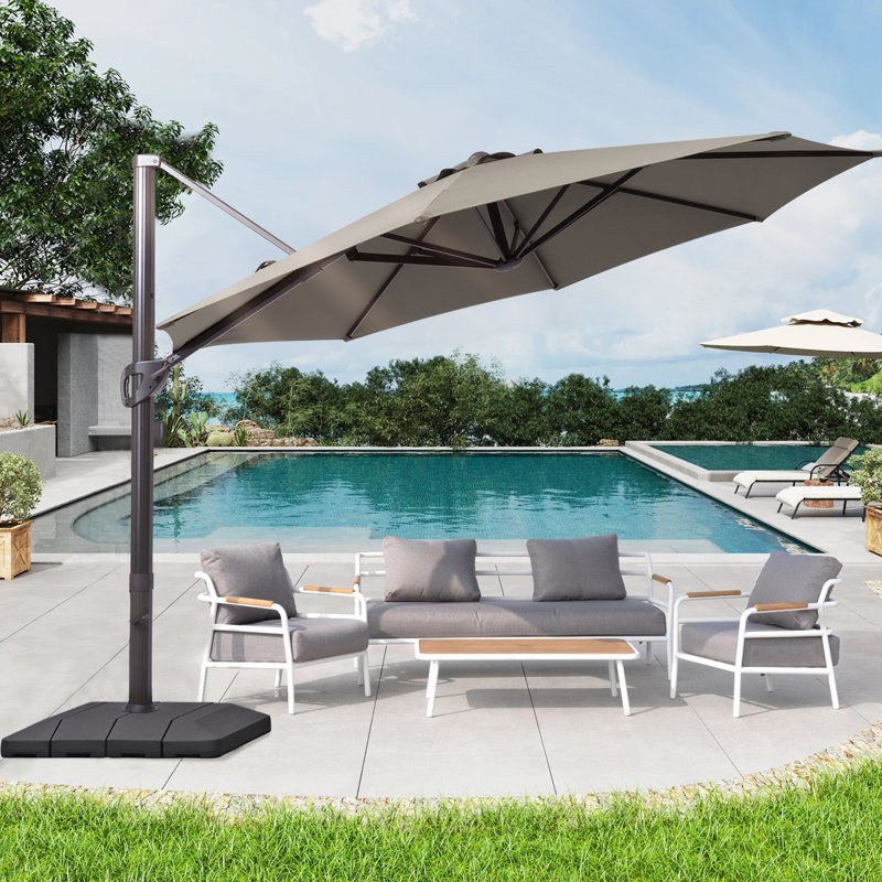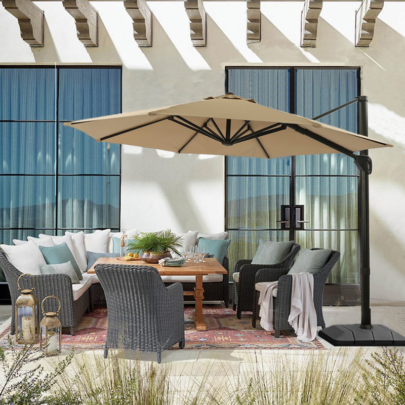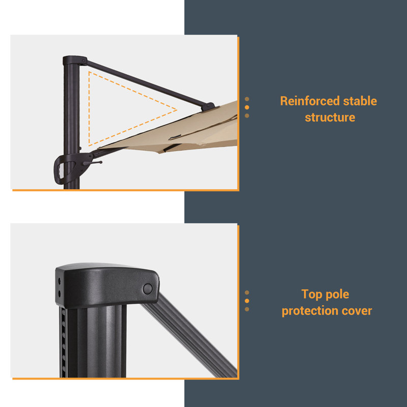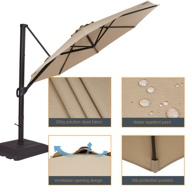 Outdoor cantilever umbrella made of 290g olefin polyester fabric, creating a durable barrier and protecting against UV rays and rainfall. It can provide 98% UV protection with good fade resistance for long-lasting use. Equipped with a 4″ aluminum pole and 8 sturdy powder-coated aluminum ribs construction, providing extra strength, the top triangle reinforces stronger wind resistance. With a 360-degree rotation mechanism and infinitely variable tilt adjustment, you can adjust the umbrella to whatever positions you like according to your different shade purposes. The operation is easy, the updated aluminum alloy hand crank is to control open and close the patio umbrella. The strap and pocket design are available for easy storage. The heavy-duty base in the picture is included in the box, it is made of abs resin, is durable, and has strong stability. No need to purchase an additional base.