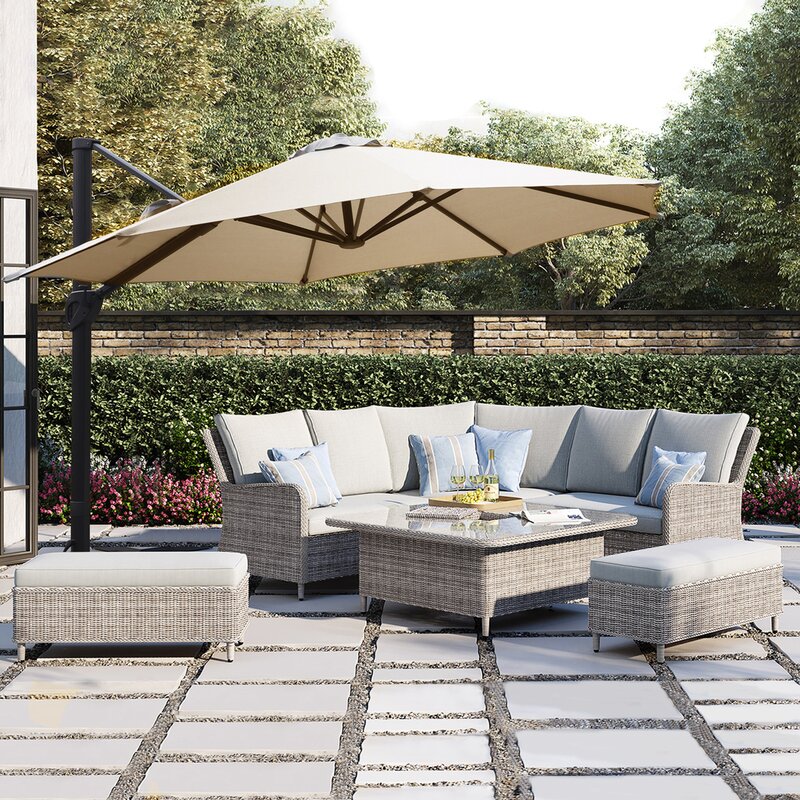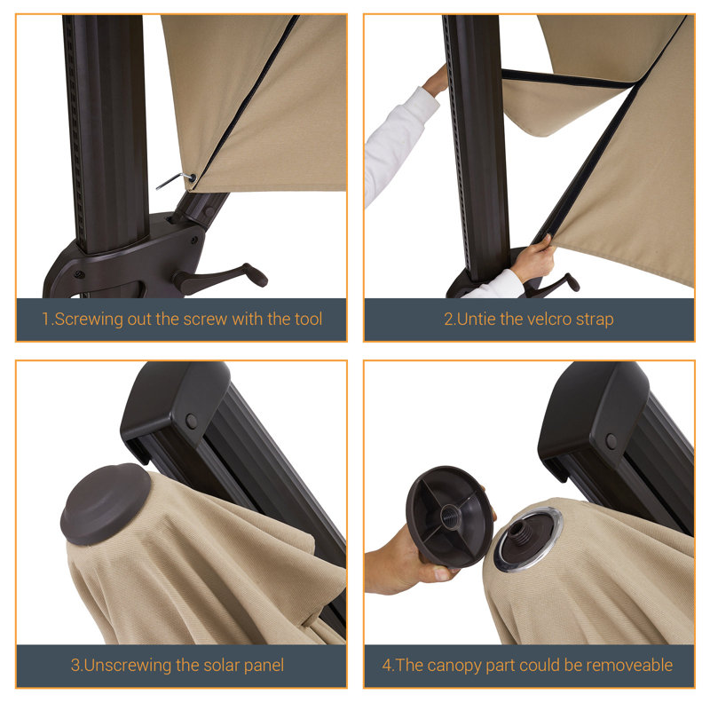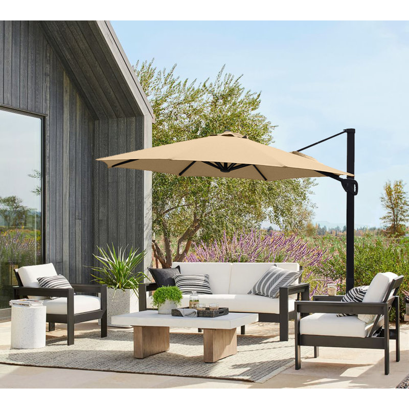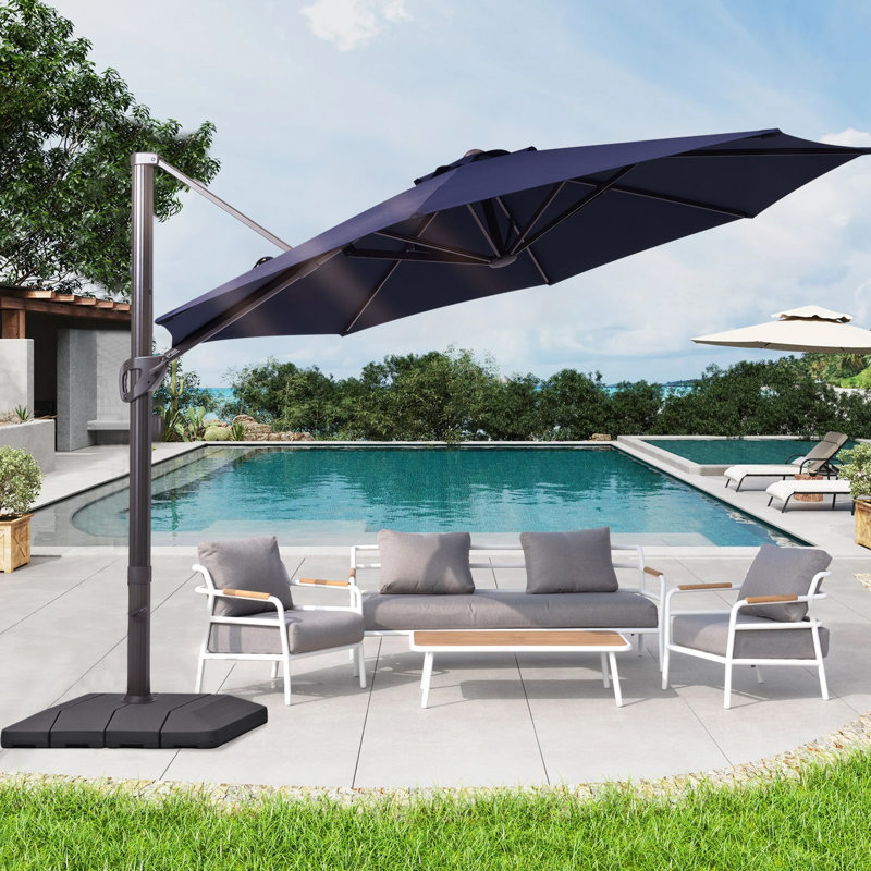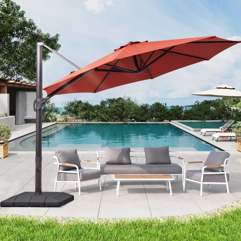 Outdoor cantilever umbrella made of 290g olefin polyester fabric, creating a durable barrier and protecting against UV rays and rainfall. It can provide 98% UV protection with good fade resistance for long-lasting use. Equipped with a 4″ aluminum pole and 8 sturdy powder-coated aluminum ribs construction, providing extra strength, the top triangle reinforces stronger wind resistance. With a 360-degree rotation mechanism and infinitely variable tilt adjustment, you can adjust the umbrella to whatever positions you like according to your different shade purposes. The operation is easy, the updated aluminum alloy hand crank is to control open and close the patio umbrella. The strap and pocket design are available for easy storage. The heavy-duty base in the picture is included in the box, it is made of abs resin, is durable, and has strong stability. No need to purchase an additional base.
