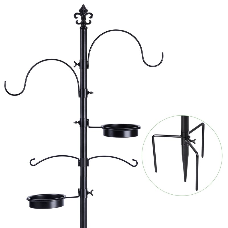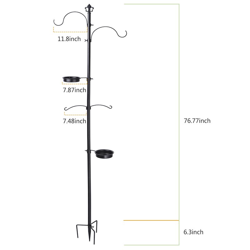 Metal feeding pole comes with twin top-level hooks which are ideal for hanging different types of bird feeders, plants, lanterns, wind chimes, and decorations. Two additional hooks provide more hanging options. An included metal water bowl functions as a birdbath while the other metal tray with drain holes can hold a wide variety of bird food