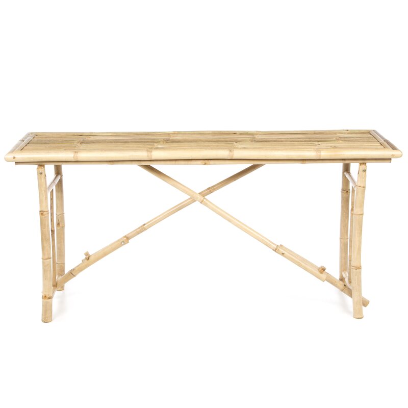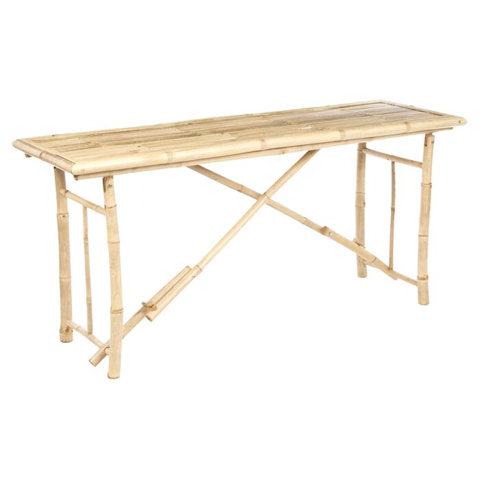 Bring island style to your living room ensemble with this folding console table. Crafted of real bamboo in a natural finish, this handmade table features a wide, rectangular tabletop with a slatted surface, while the four-legged trestle base features an X-shaped center brace. Perfect for parties, this table can be quickly set out to hold everything from drinks to appetizers and hors d’oeuvres, and can be folded for space-saving storage when not in use.