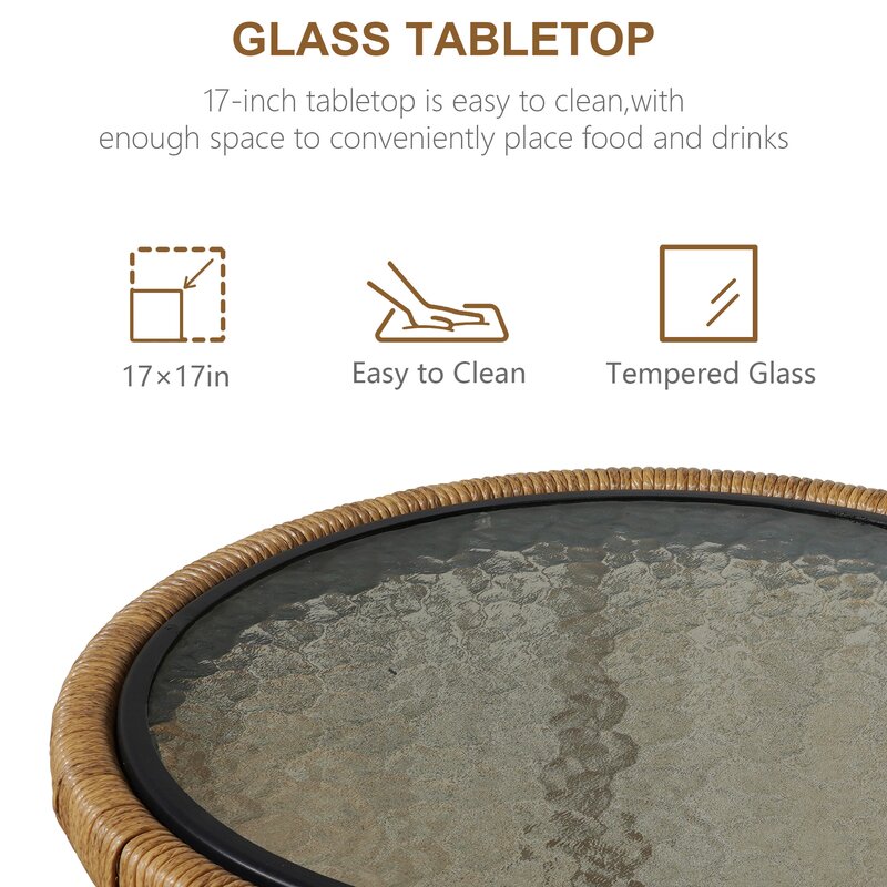 This classically designed outdoor 3-PC wicker bistro set is composed of 2 armchairs and a circular accent table to place books, small snacks, and beverages. Our rattan patio furniture set is made of brown pe rattan and has a strong steel frame, tough enough to withstand rain, wind, and high outdoor temperature for long-term use. The see-through design and tempered glass tabletop make this elegant, eye-catching bistro set the perfect fit for any porch or patio setting. Durable, weather-resistant seat and back cushions provide optimal comfort as you lounge with family or loved ones.