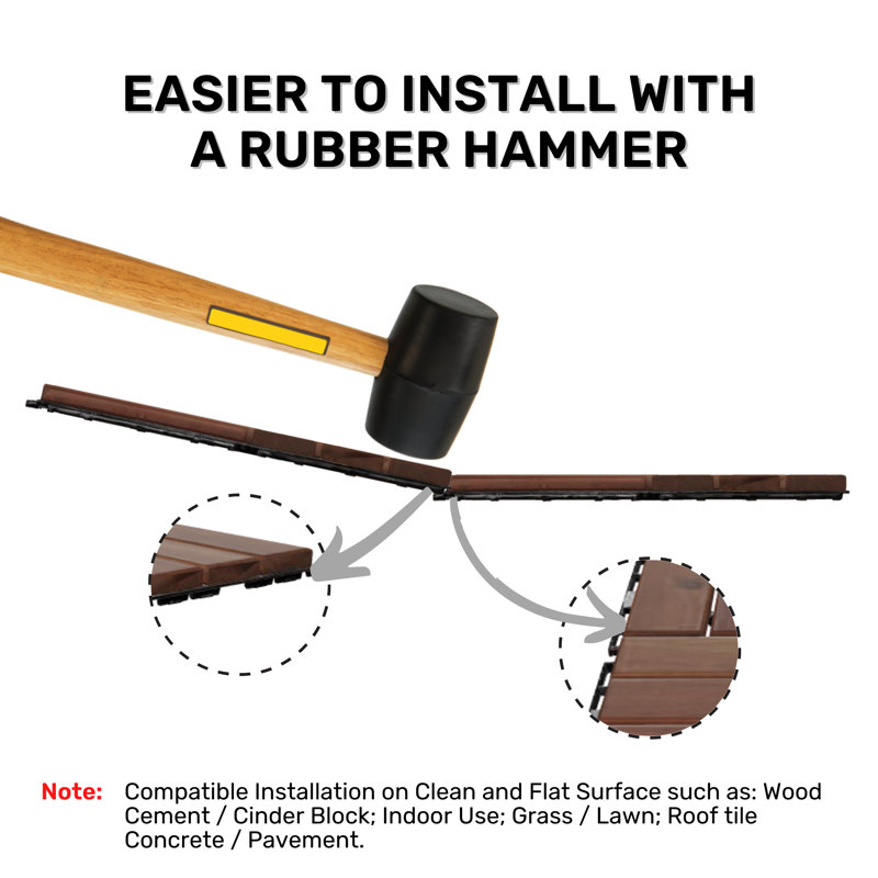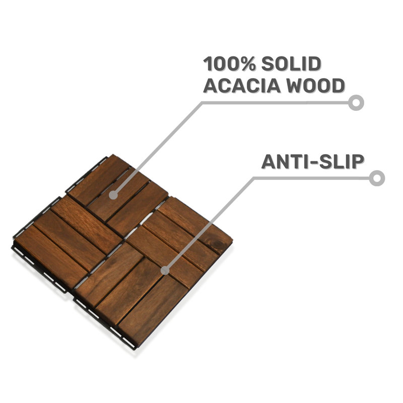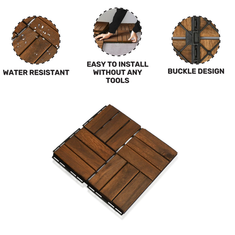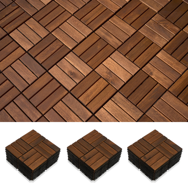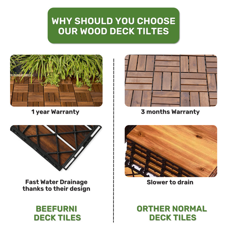 Let our interlocking flooring tile renew your balcony, deck, rooftop, patio, backyard, bathroom or garden without spending too much. These acacia wood interlocking flooring tiles are made of 100% solid acacia wood and plastic base. Plus, these are finished by a layer of water-based oil, which helps this patio flooring interlocking deck tile use well outdoors in natural sunny and windy environments. Thanks to their buckle design, you can install them easily without any tools, kids can even do it. Also, these patio floor interlocking patio tiles can be cut and used as a corner, edging, trim tiles or molding pieces for flooring. Note: we recommend giving these titles a good clean using wood preservative or wood oil before summer and winter to help them keep their great appearance and durability.