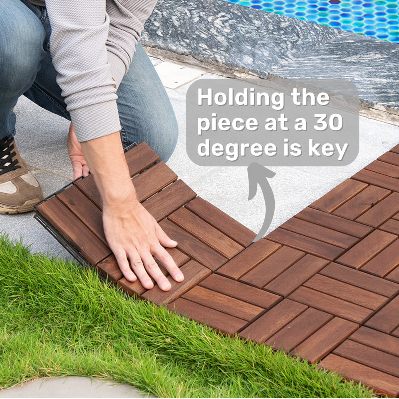 High-quality Materials: These snapping deck tiles, interlocking wood tiles are made of durable plastic base and high-quality Acacia wood, which is hard, durable, mildew and mold resistant. Raw wooden slats will be passed a drying process around 15-20 days which make sure the slats keep correctly humidity rate around 8-12%. This process help teak cutting board well adapt to the room’s temperate in during usage.