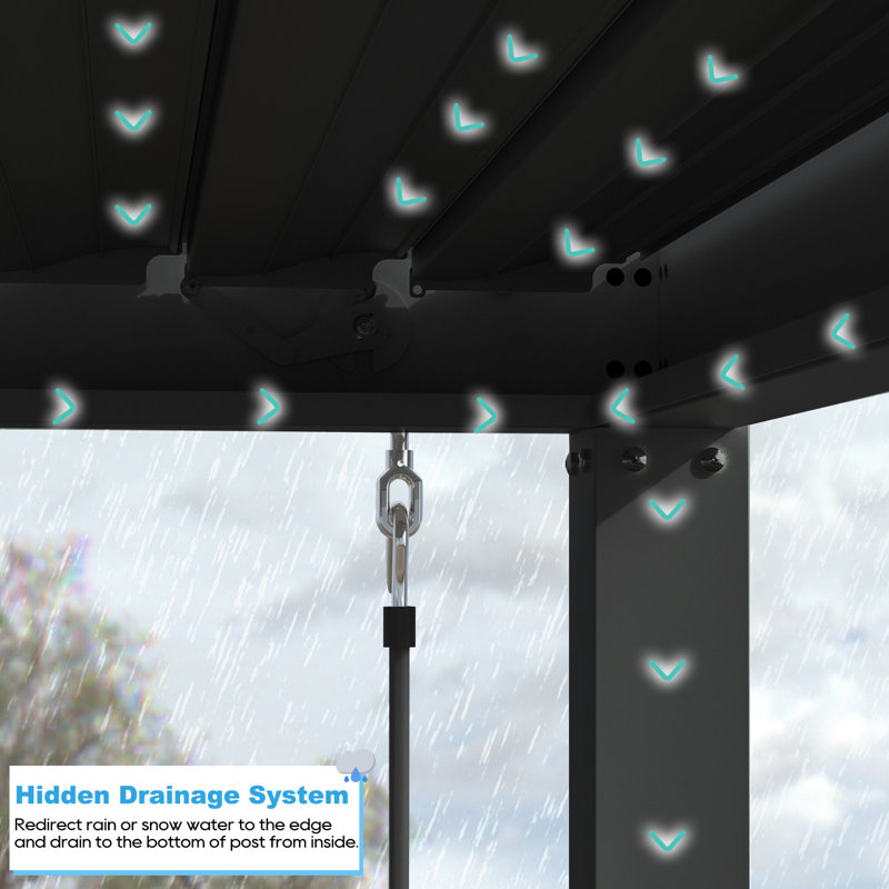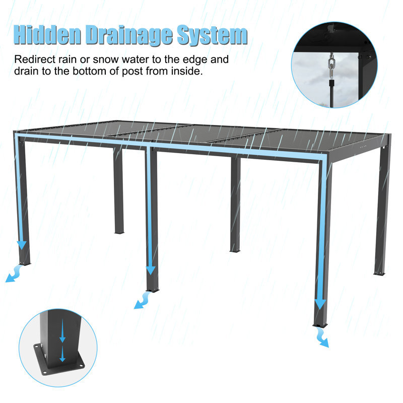 Hidden Fast Dry Drainage System: Our outdoor pergola has a built-in gutter system along the roof, and rainwater will be diverted to the columns and avoid water accumulation on the roof and keeping dry underneath