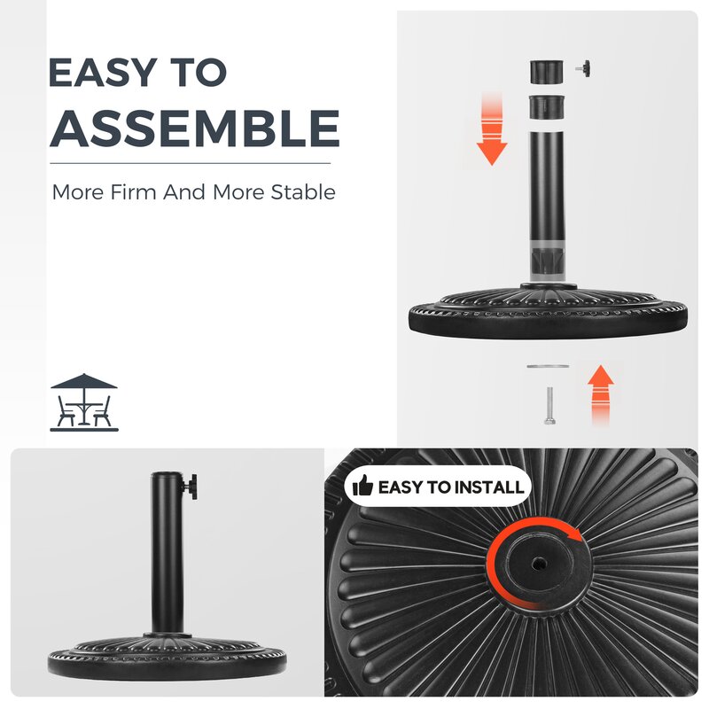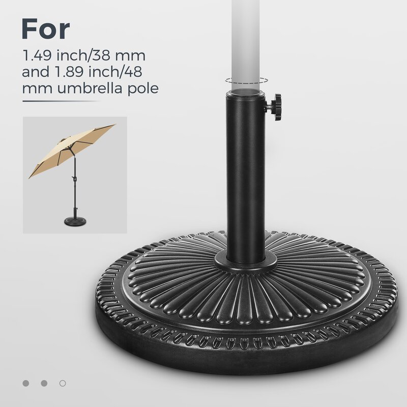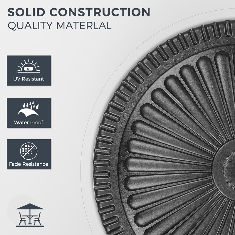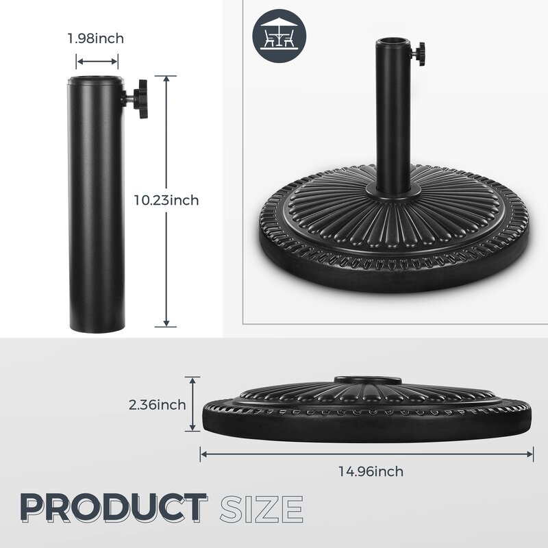 This 15″ Dia Outdoor Round Stand is a Sunflower Designed with 22 lbs. Resin Material with a Black powder-coated finish which is perfectly fitting and holds your outdoor umbrella securely. Sunflower designed pattern in the Black finish is suitable for any outdoor patio. Includes a coupler to allow it to fit for 1.5-1.9 inch Dia umbrella poles. Easy to assemble. Sturdy enough for home and commercial use.