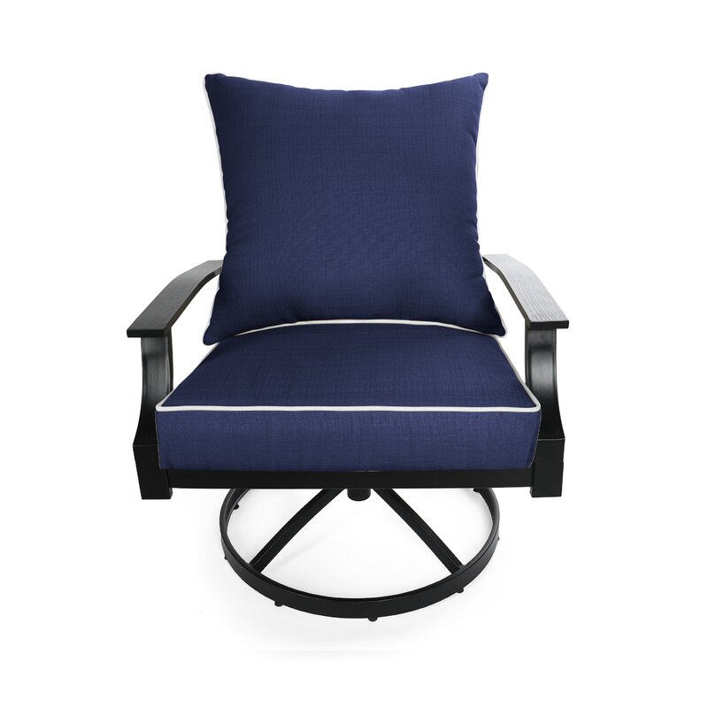 Create your dream patio with the Deep Seat Cushion Set! Designed for maximum comfort, this high-quality seat cushion and back pillow set is the perfect addition to any outdoor space and instantly upgrades your current patio furniture setup. Made of solution-dyed polyester yarns that are UV protected and fade resistant, this set is great for continued use, season after season. The seat cushion is filled with 100% densified polyester fiber and back pillow is filled with blown polyester for soft to medium support. You can also rest easy knowing this item is recyclable and crafted in an environmentally friendly manufacturing process. In a classic blue color, this set coordinates with any décor. It is also bleach cleanable, making it a practical solution for your outdoor furniture needs. This set includes 1 seat cushion with ties measuring approximately 24″ x 24″ x 4.5″ and 1 back pillow measuring approximately 26″ x 26″.Extend the life of your cushions by keeping them free of dirt by following these easy steps. For minor spots and stains, spot clean with a mixture of mild soap and water. For tough stains, a mild solution of one part bleach and two parts mild soap and water may be used without affecting the color or damaging the fabric. To prevent mildew, stand cushions on end and dry completely before storing. We also recommend using outdoor covers (purchased separately) when not in use. During inclement weather or when not in use for long periods of time, cover and store cushions indoors in a dry place.Outdoor Fabrics make a great addition to your outdoor and patio furniture. Trust for high quality performance fabrics.