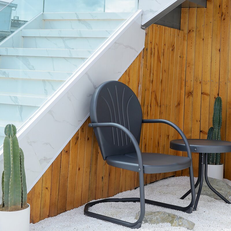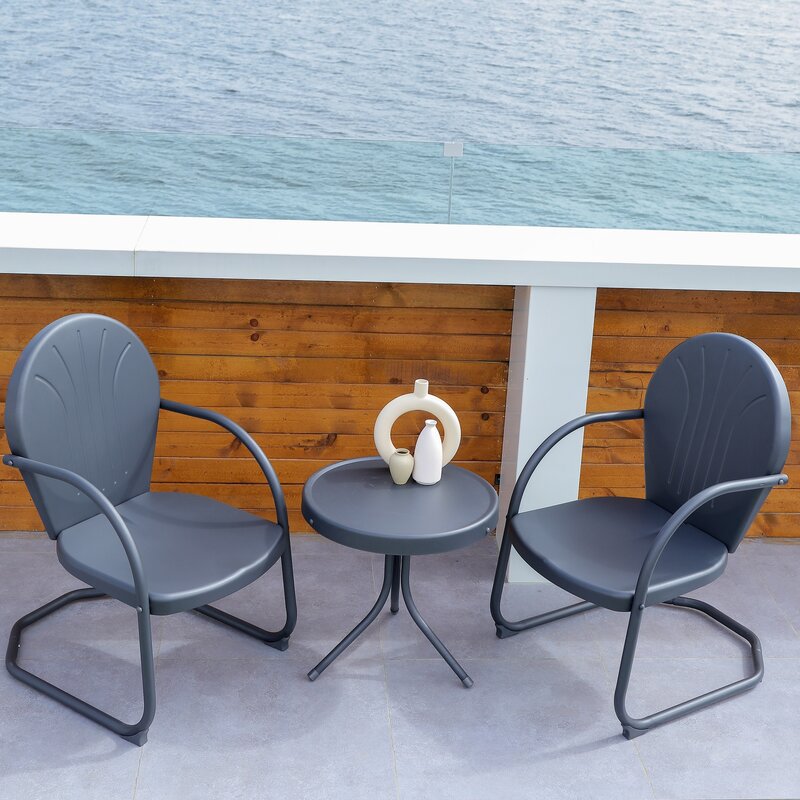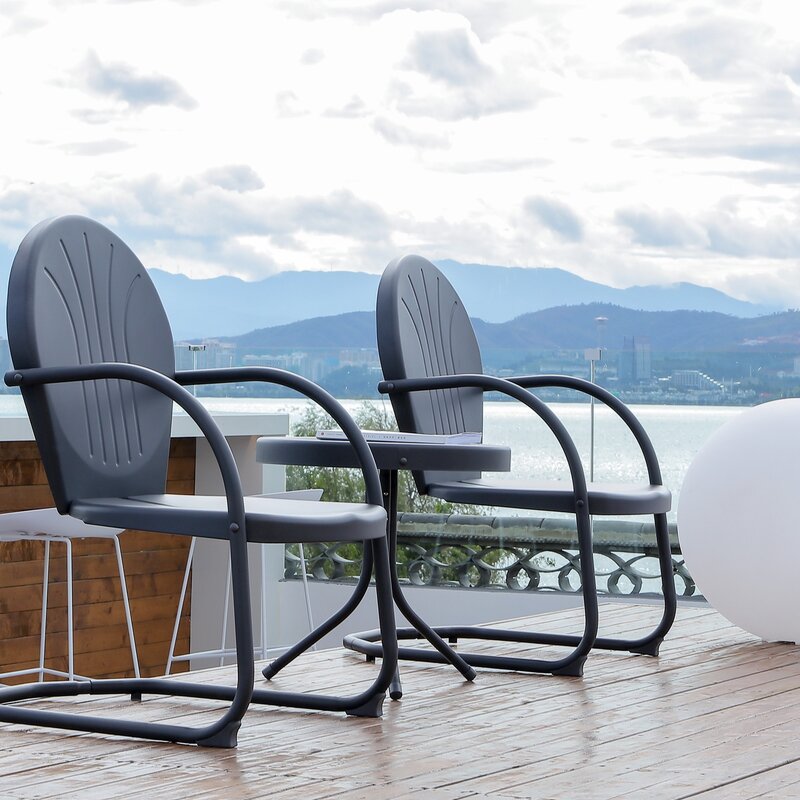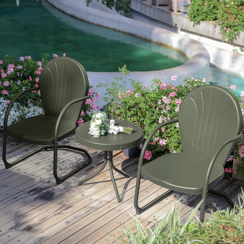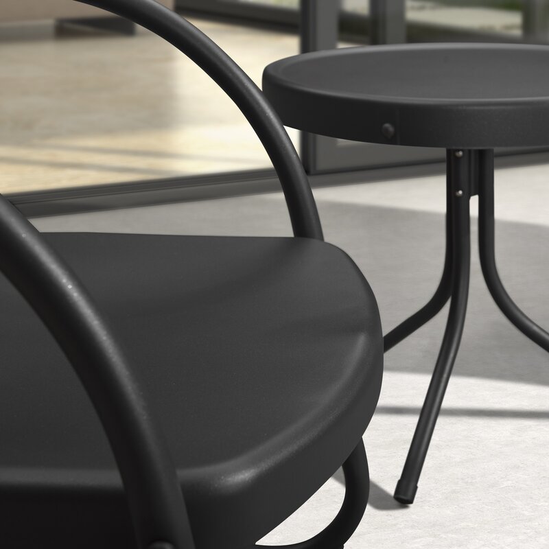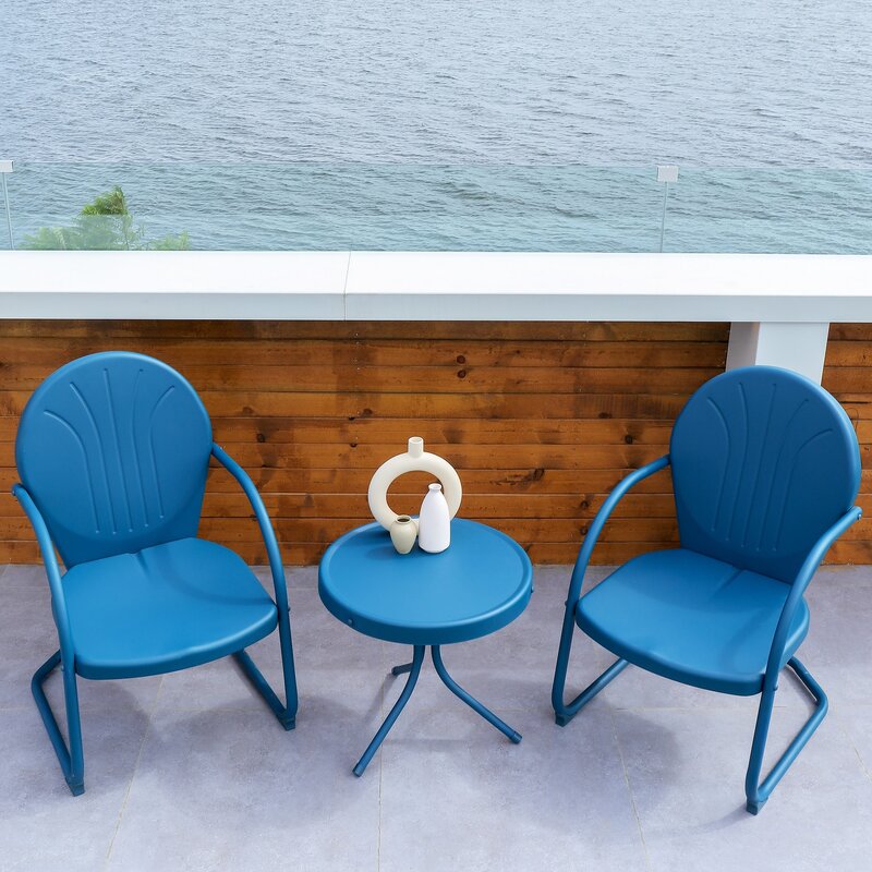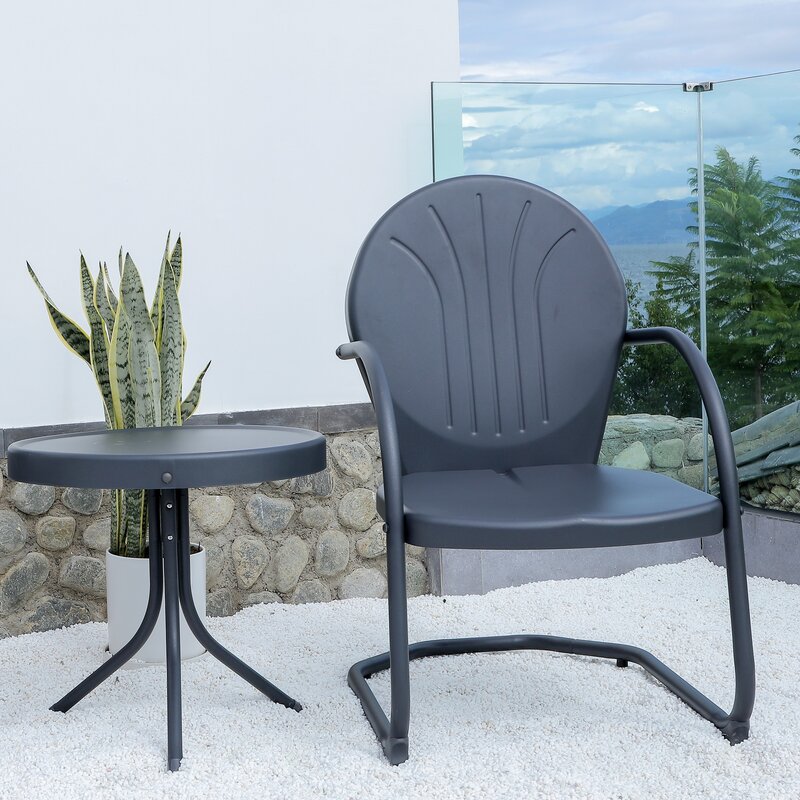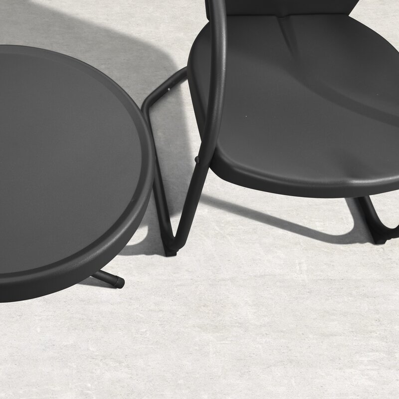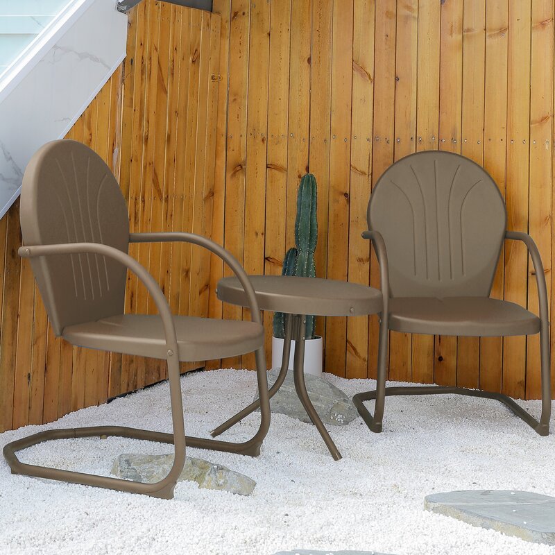 Retro-style outdoor bistro set includes one round side table and two outdoor chairs for a funny and practical lounging experience