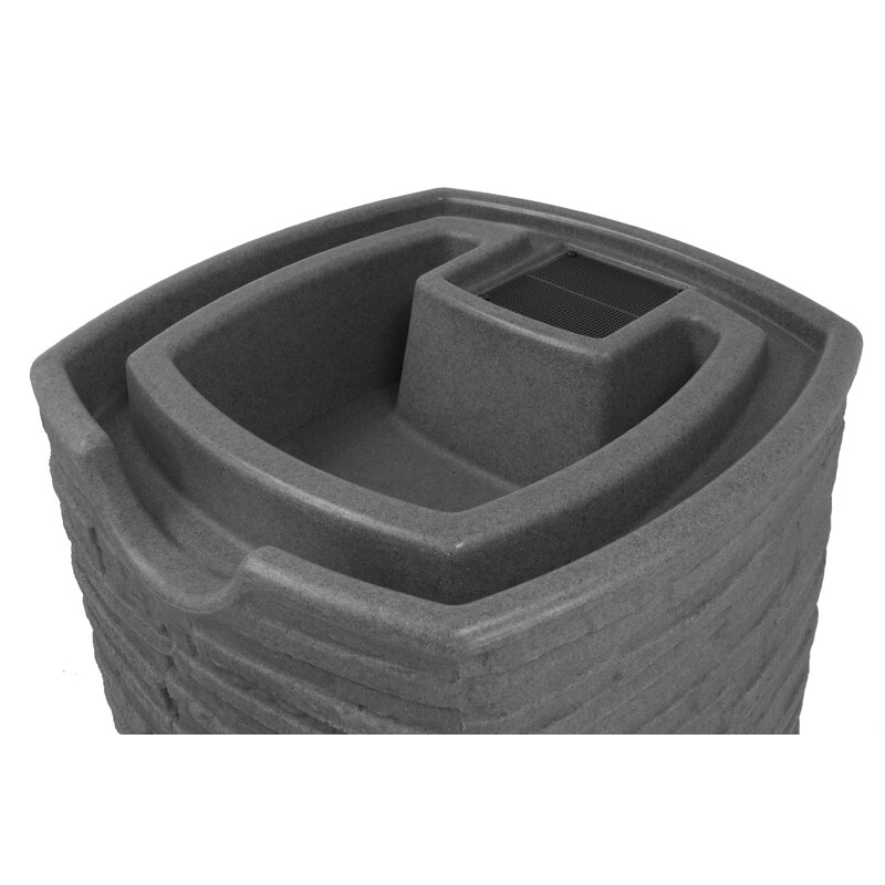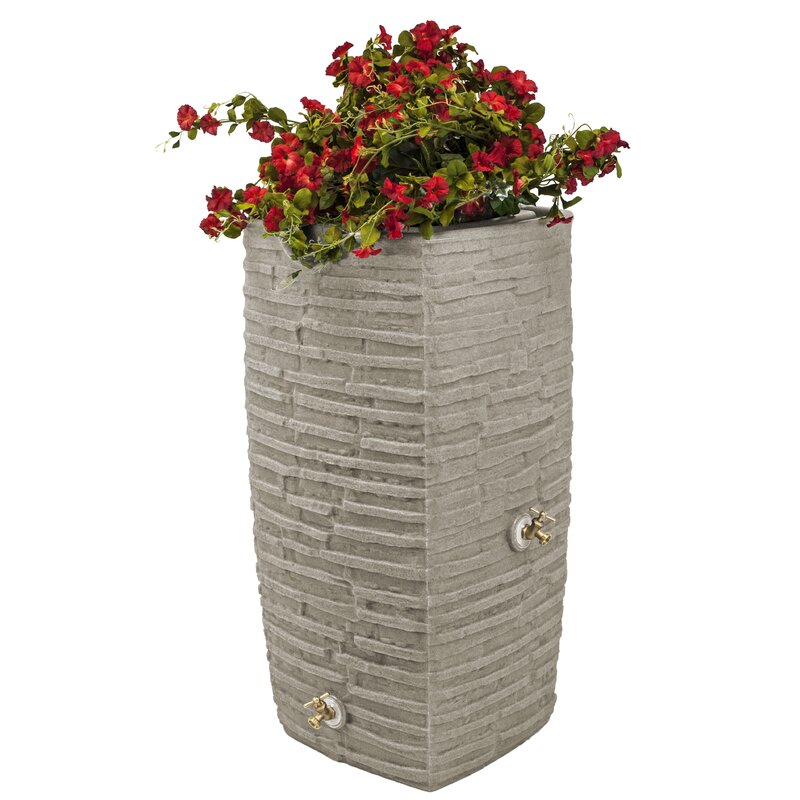 This rain barrel is sturdy and one of the most eye-catching rain barrels on the market. Its unique, slate rock surface creates a natural texture that shows how this barrel can be more artful in aesthetics instead of an obvious utility product. With a deep-welled top, you can plant an array of floral arrangements or even a small herb or vegetable garden. The top also includes good ideas, and an original, integrated overflow channel. This channel automatically diverts all overflow water to the front of the barrel and keeps your foundation from flooding. This screen keeps out heavy debris and insects for your peace of mind.