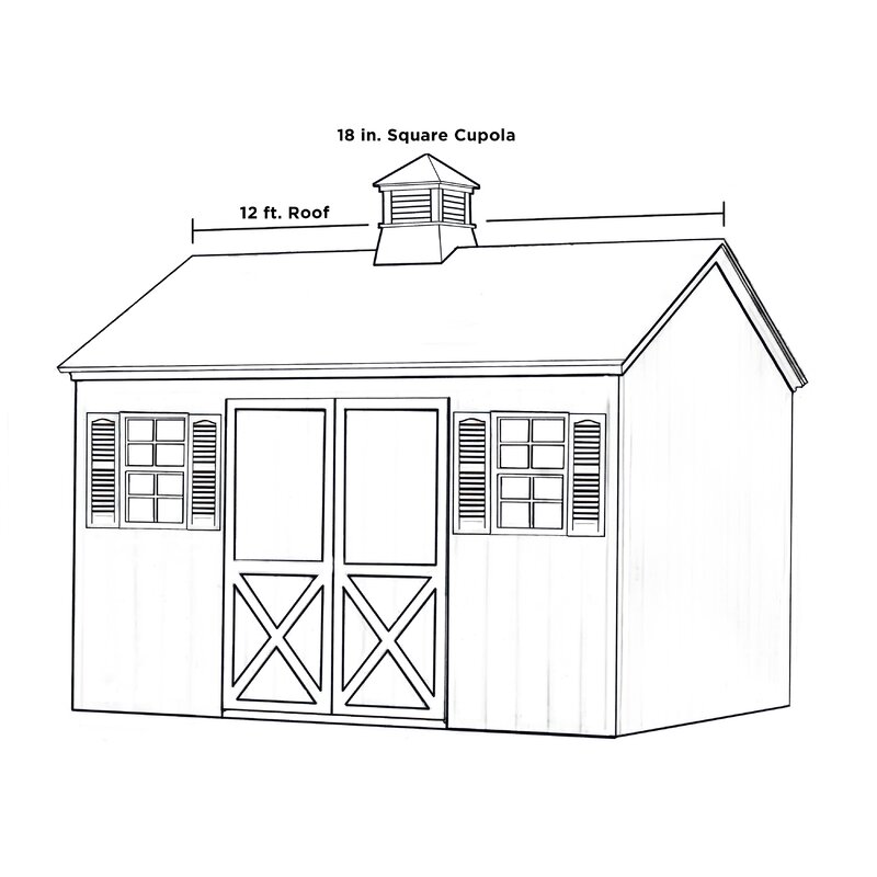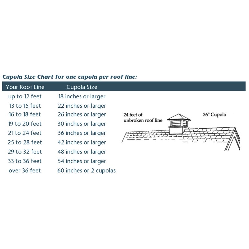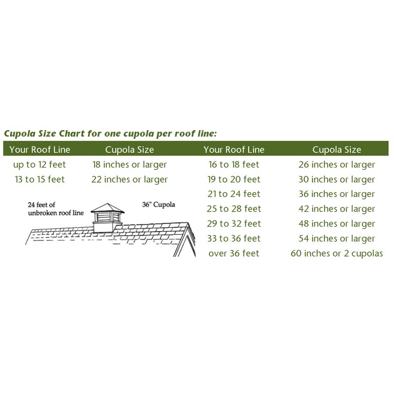 Dimensions Assembled: 26″Sq x 32″ H. Square size measured at roofline. Fits up to a 10/12 pitch roof (most roofs). When calculating the size of your cupola, use our steadfast builder’s rule of thumb: 1.5 inches of cupola width for every foot of unbroken roofline. See the photo for more information.