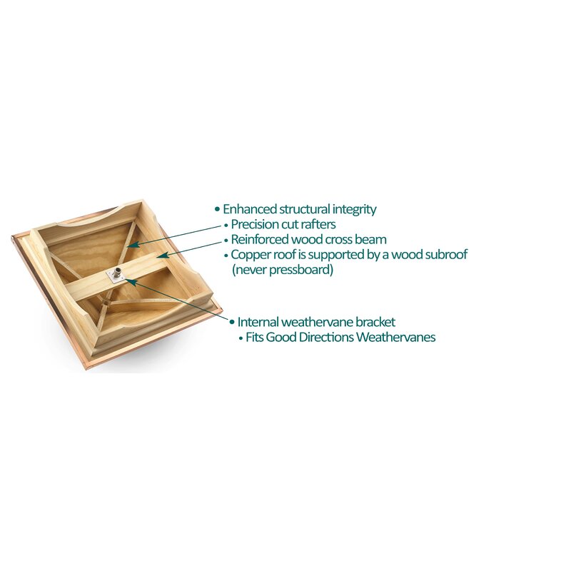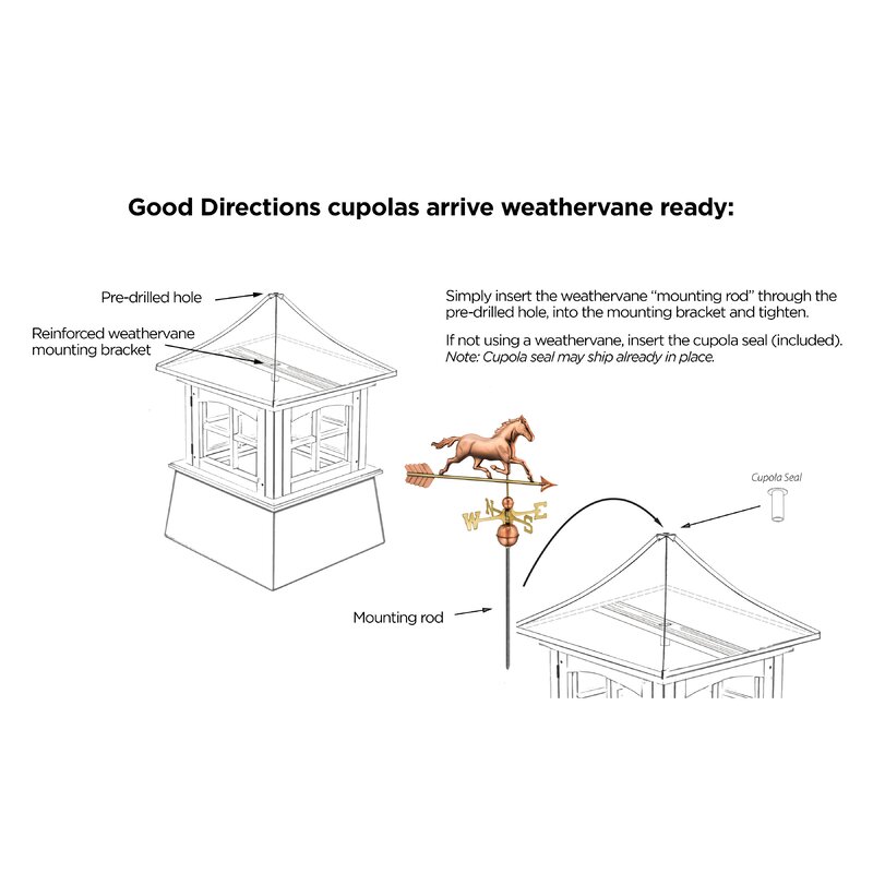 Weathervane Ready: Cupola is ready to accept a Good Directions weathervane. Includes pre–installed weathervane bracket inside the roof for easy installation. Weathervane rods can be easily inserted through the precut hole on top of the roof. A brass seal is also included to close the insert if you choose to enjoy your cupola without a weathervane. This will ensure your cupola remains completely waterproof. The insert is easily removed if you decide to add a weathervane to your cupola in the future.