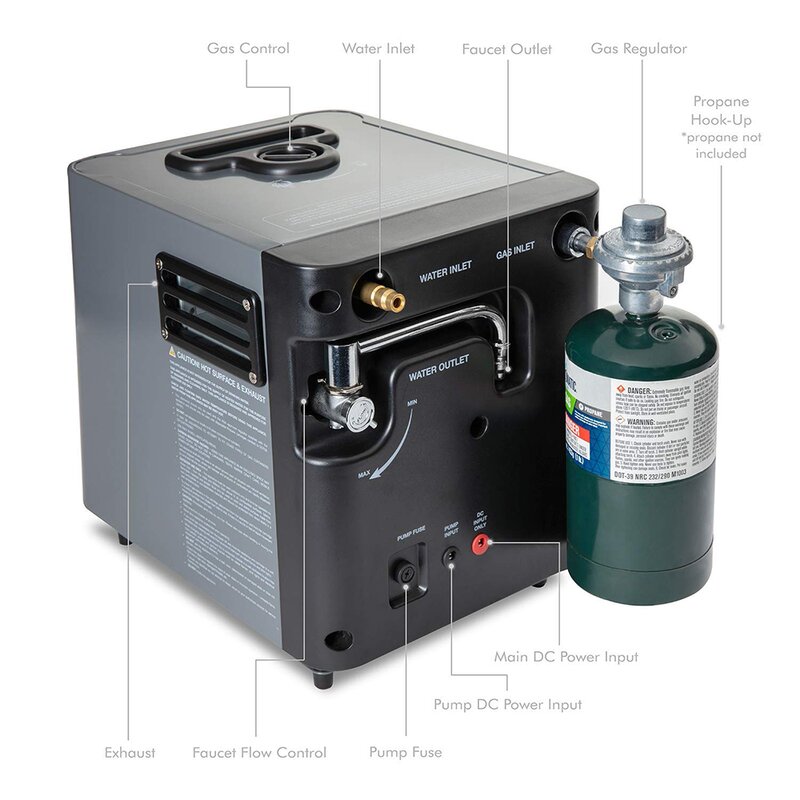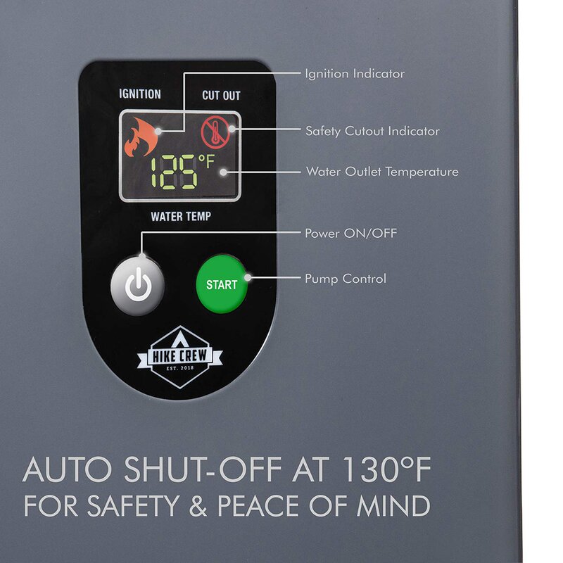 The innovative system runs on a propane gas tank to heat water for multiple purposes like showering, washing dishes, cleaning hands, etc. Smart technology turns off the gas burner when water reaches 125 degrees Fahrenheit. The unit also has a tilt switch, water flow sensor, and fuse protection for added safety. Digital panel control allows you to start the pump and monitor the precise water temperature.