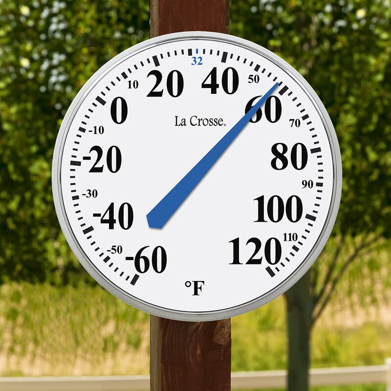 An analog thermometer requires no batteries for operation. The durable plastic frame can be hung indoors or used outside. Keyhole mounting on back.