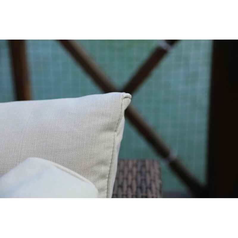 This Vernis 7 Piece Rattan Sofa Seating Group cushion provides a great opportunity to transform a garden into a fantastic relaxation space, where you can spend quality time with family and friends. This larger set comes complete with an ottoman and table with a 5mm thick tempered glass top. The comfortable and plush cushions are covered in a luxury fabric that can be easily washed when needed, this set will create a focal point in your garden effortlessly. It should be noted that in hot weather, the glass will absorb heat and may cause damage to the wicker of the tabletop. It is recommended to cover the tabletop in hot weather or keep it in a cool place to avoid direct sunlight or rain.