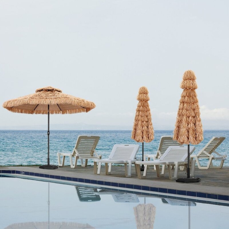 Hawaiian style straw umbrella and features PE thatch polyester fabric. Powder-coated steel pole against rust, corrosion, chipping, and peeling.
