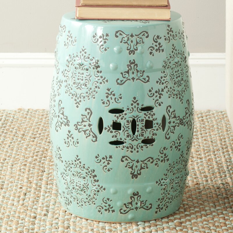 Adorned with lacey Asian motifs adapted from silk brocade fabrics, the Hiran garden stool adds an international flare to indoor and outdoor spaces. With gray patterning on light blue glazed ceramic, this versatile piece can be used in pairs in front of a bed, as extra seating, or as a handy side table.