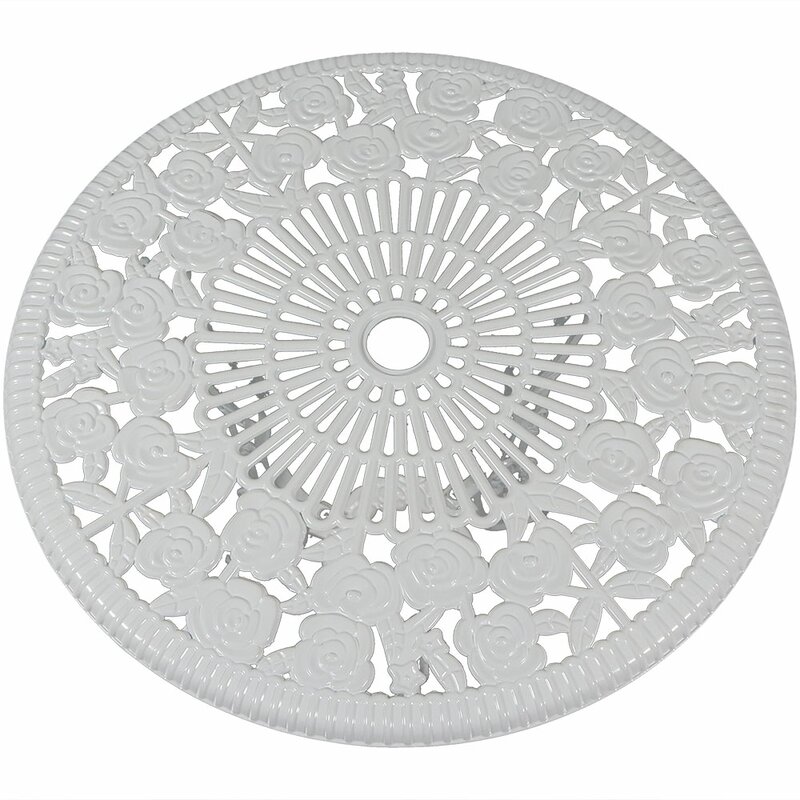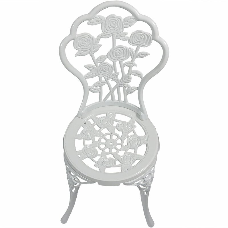 The perfect spot for a mid-morning brunch or starlit dinner for two, this three-piece bistro set brings country cottage charm to any outdoor space. Openwork floral details give this set its distinctive appearance, while a crisp white finish is sure to pop against the green grass and patio bricks. Crafted of cast aluminum, this design resists the elements for year-round enjoyment. The bistro table stands 26″ tall and features a 2″ umbrella hole.