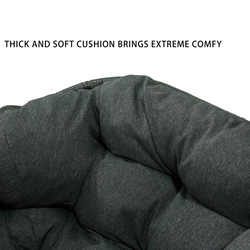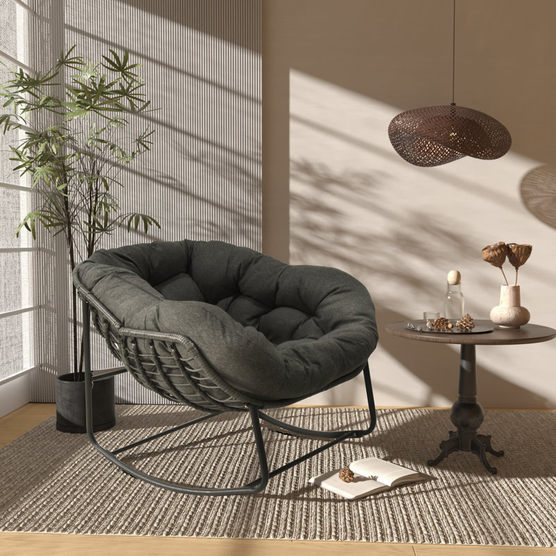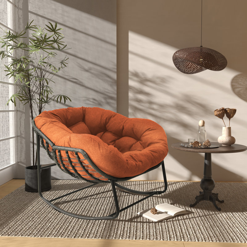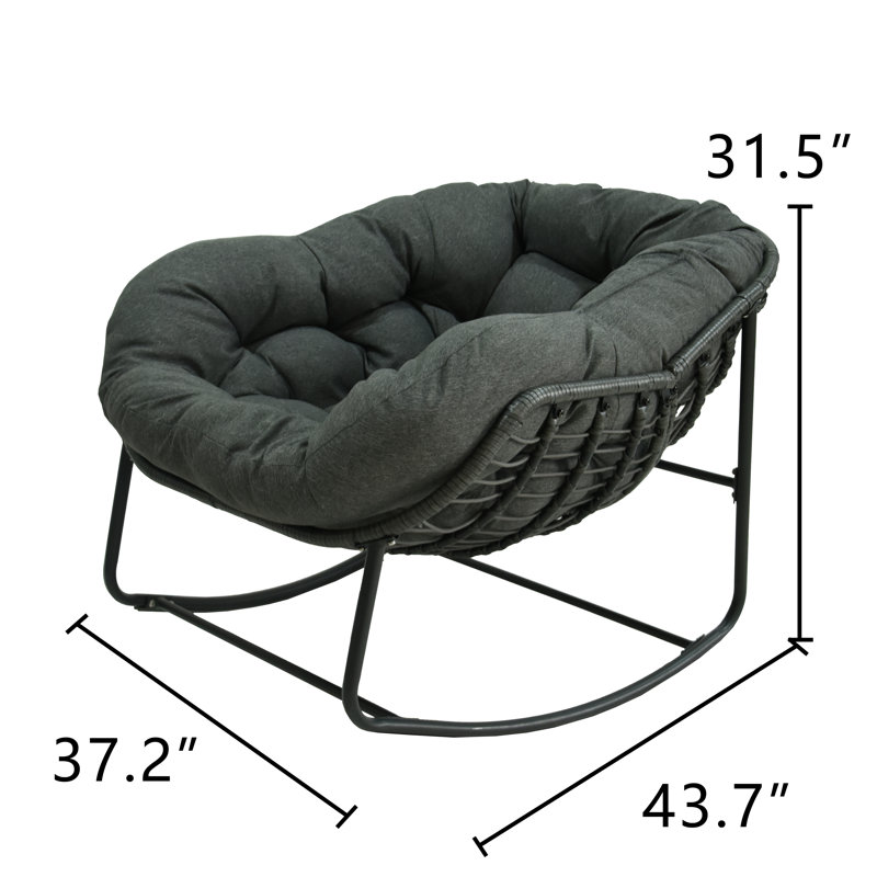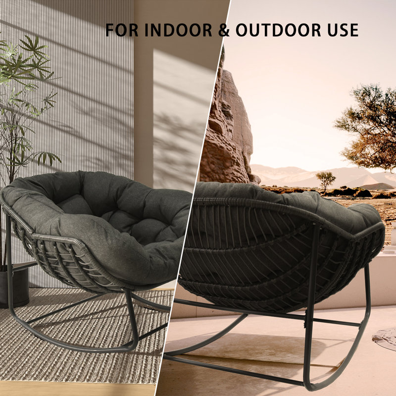 Sink into this charming outdoor rocking chair and enjoy summer breeze. With cute bowl-shaped seat and gentle rocking function, this delightful chair instantly upgrades your backyard or patio space with style and comfort. Topped with a thick, tufted cushion, the seat is soft and cozy, gives you the feeling of lying on a cloud. Constructed with a sturdy metal frame, this rocking chair is sure to bring you relaxation for years to come. The PE wicker and fabric are UV resistant, fade resistant and waterproof, feel free to leave it outdoor for long time.