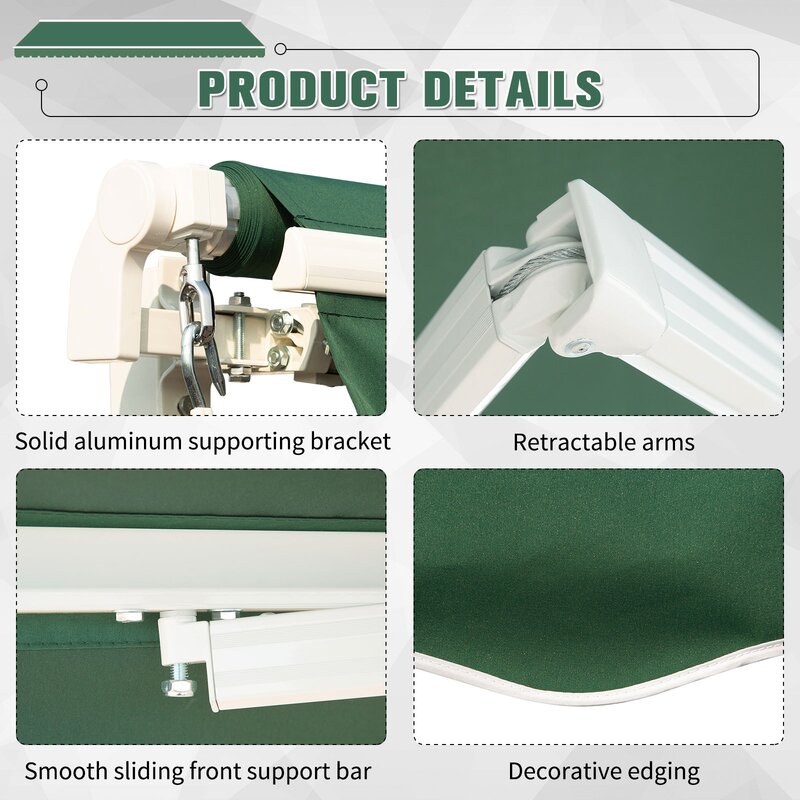 With its sturdy aluminum and solid steel frame, this retractable patio awning is ideal for creating shade. The reinforced frame and UV-resistant polyester fabrics make the awning superior in material and excellent in workmanship. It can be easily mounted on the wall with the included accessories. Our awning will create a nice and cool place on your porch or patio and protect you from harmful UV rays. Enjoy both beauty and protection with this outdoor awning at its incredibly affordable price. Ideal for installation at a patio, a balcony, or a storefront. Adjusted steel crank handle for manual closing and opening. Excellent protection against UV rays and is fade-resistant for long-lasting use. High-density 280gsm polyester with PU coating. Solid aluminum supporting bracket for long-lasting use. Polyester fabric supported by 2 retractable arms, reel, and a front support bar. Can easily attach to plain cement wall or stable unrendered brickwork with matching screws. 2 wall brackets included for added stability.