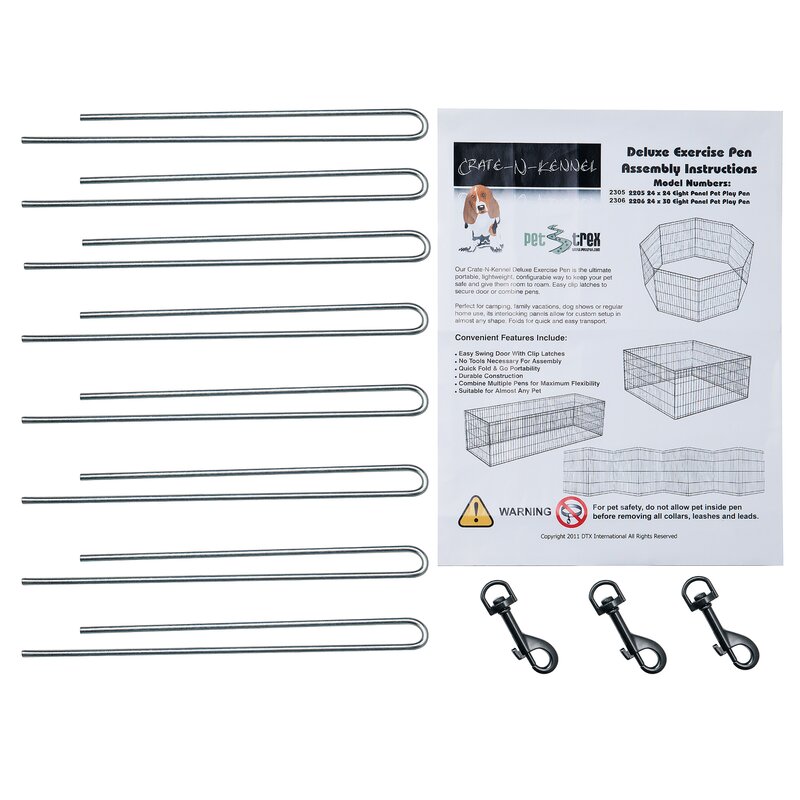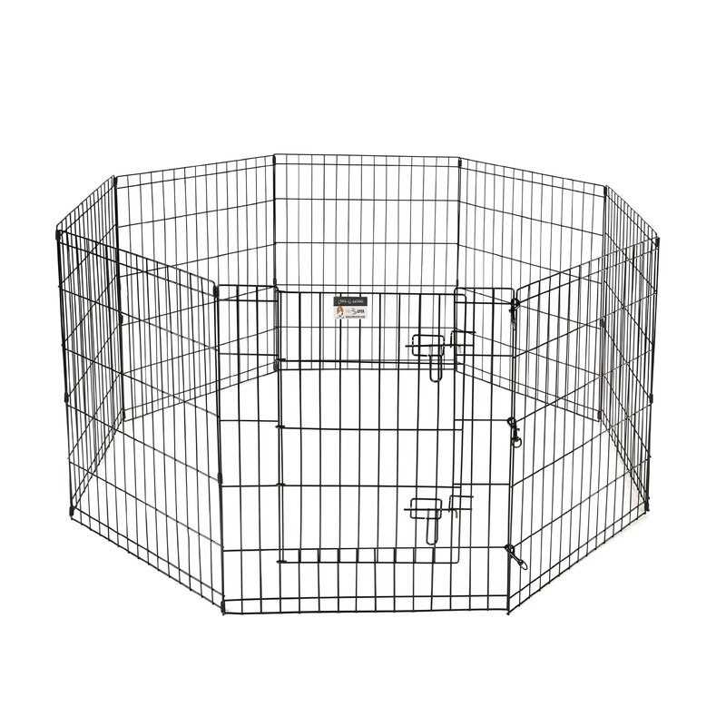 The manufacturer has done it again with their 2300 series exercise play pet pen. This premium quality exercise pen is constructed from heavy gauge wire and incorporates all the bells and whistles of units selling for 3x as much. Whether you have a new puppy or an adult dog, the crate-n-kennel exercise plays pet pen can be set up indoors in minutes without tools. It can also be folded up for easy storage or for transporting to another location. The set-up includes 8 panels that are designed for a variety of pets. This latest design incorporates This new “doggie door” feature so you can quickly enter and exit the pen.