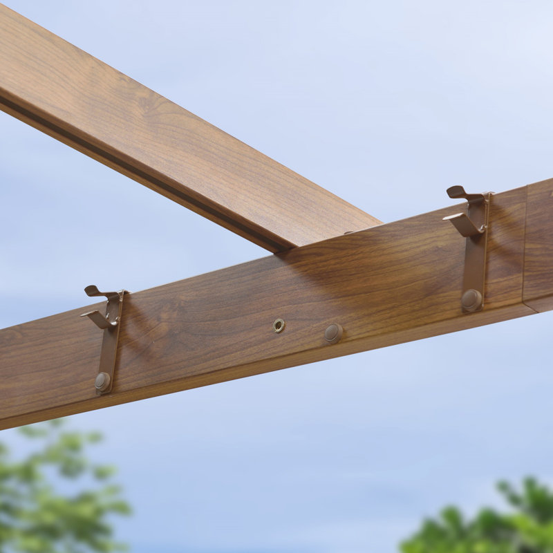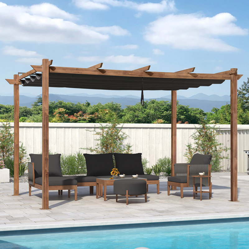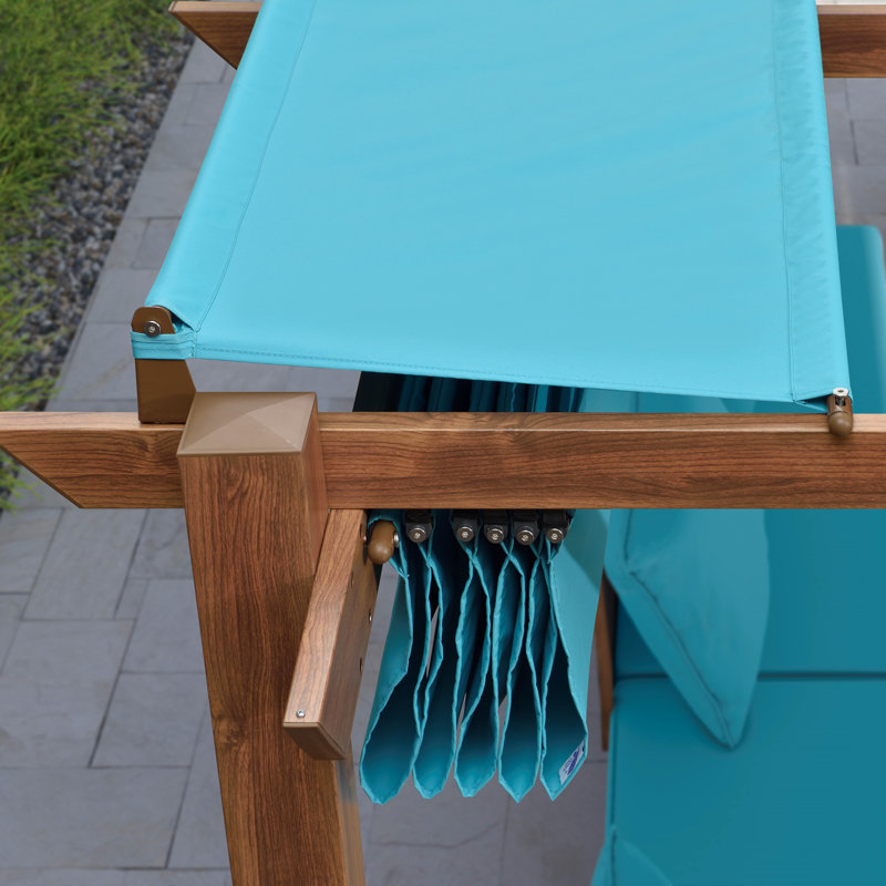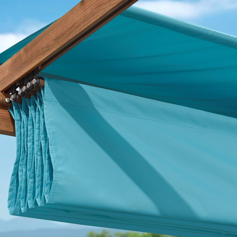 The canopy was made of durable yarn-dyed fabric which holds its color better and it’s water-repellent, fade, and UV resistant. Add a shade canopy on the top of the pergola to protect the retractable canopy from UV rays and rainwater accumulation.