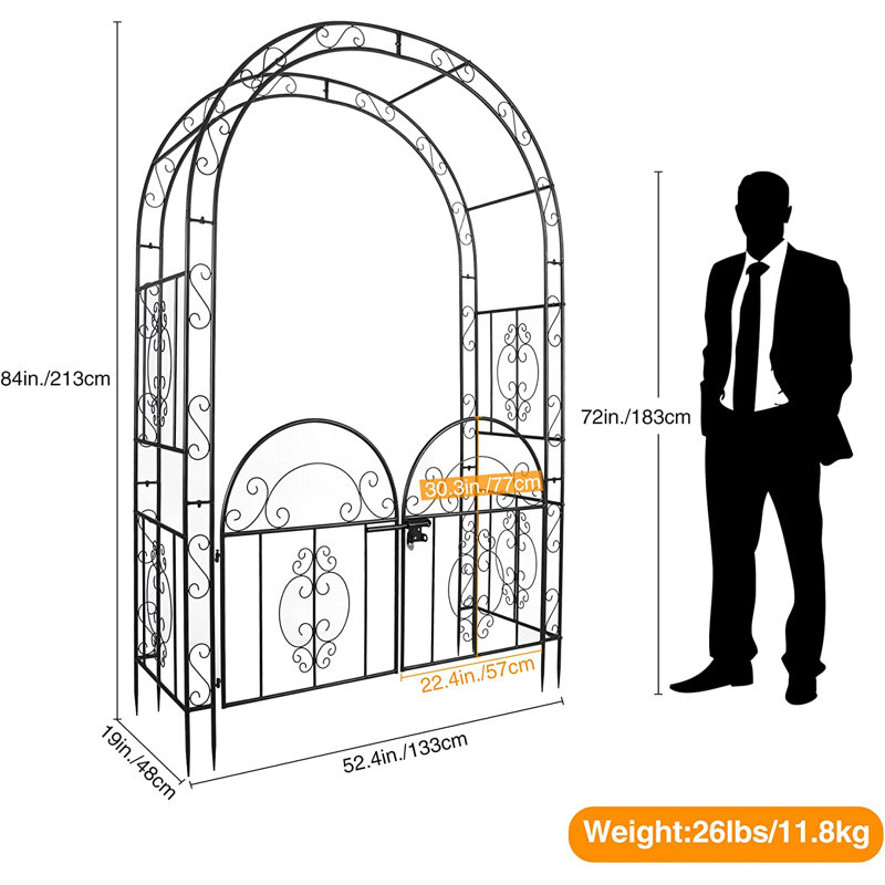 The garden arbor with the gate has an elegant curve, which brings style to your garden and walkway. The size is 52.4’’x19’’x84’’/133x48x213cm. The weight is 26 lbs/11.8kg.