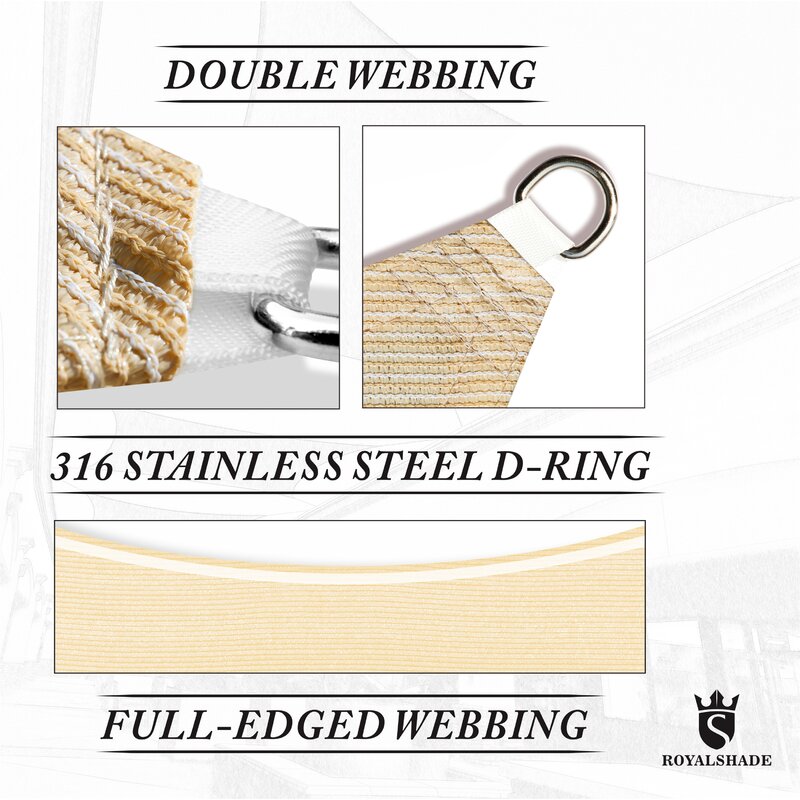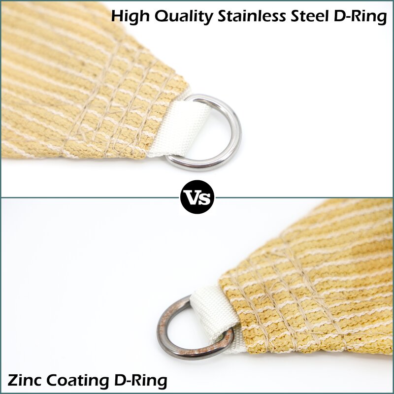 Edges are finished with heavy-duty double-layered reinforced stitched seams, to prevent frayed edges and keep the shade sail in shape, stainless D rings are attached to each corner for easy installation, and corners are constructed with an extra amount of stitched seams to maximize the strength of D rings.
