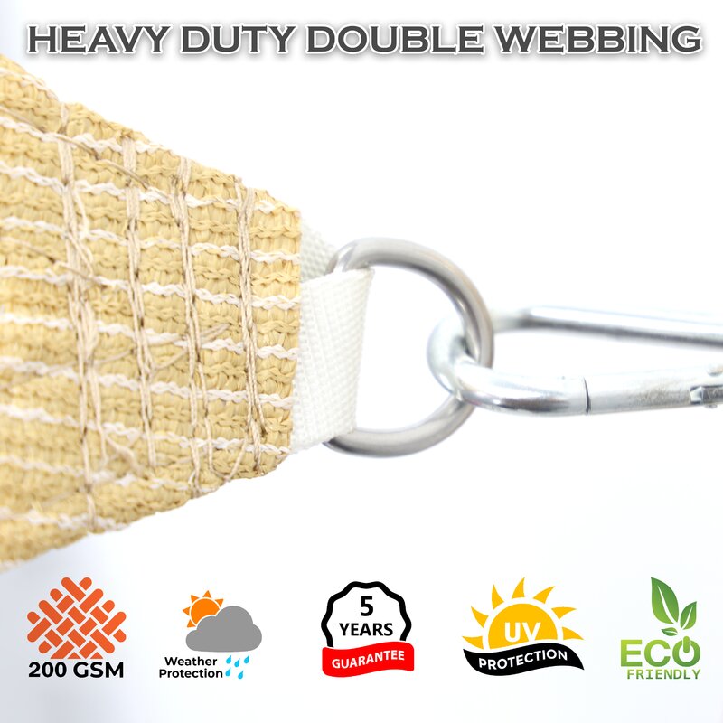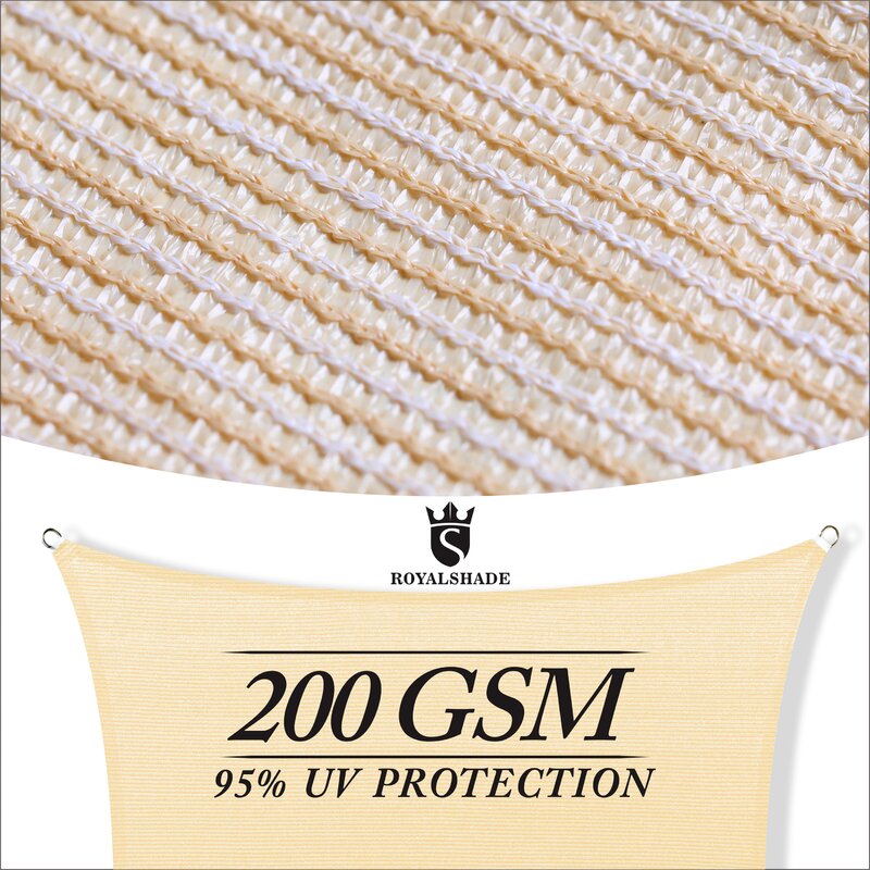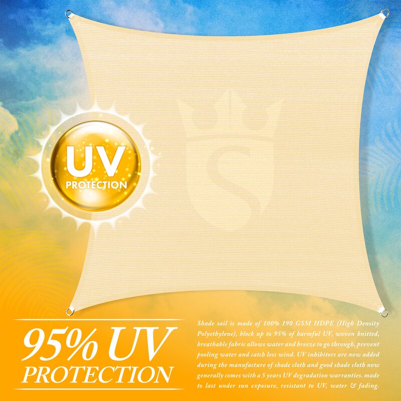 A shade sail is made of 100% Non-Recycled 200 GSM HDPE (High-Density Polyethylene), blocks up to 95% of harmful UV, woven knitted, breathable fabric allows water and breeze to go through which prevents pooling water and catches less wind. UV inhibitors are now added during the manufacturing of the shade cloth and quality shade cloths now generally comes with a 5-year UV degradation warranty. Made to last under sun exposure, resistant to UV, water & fading.