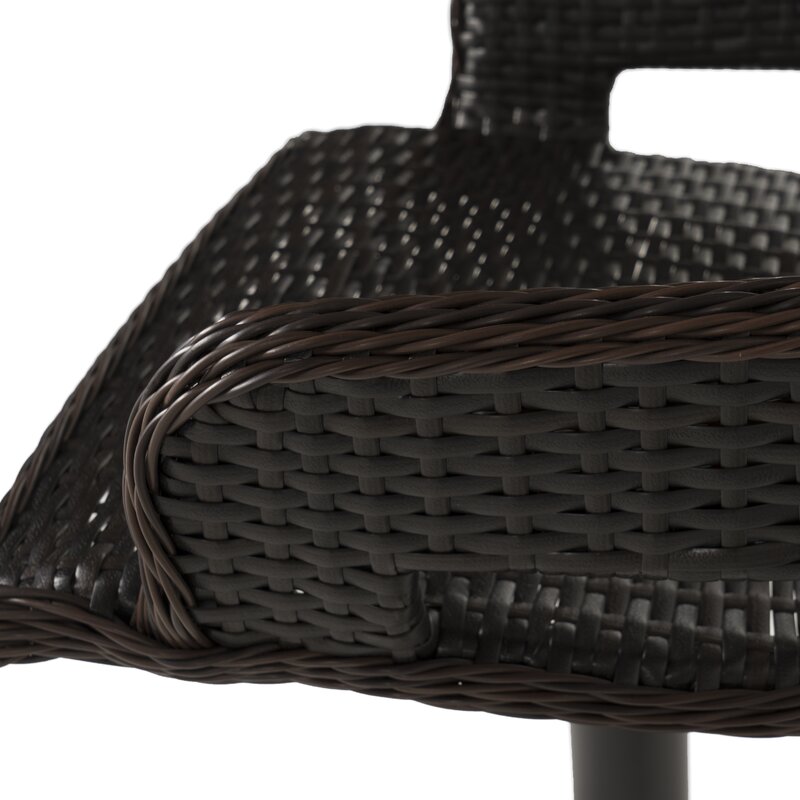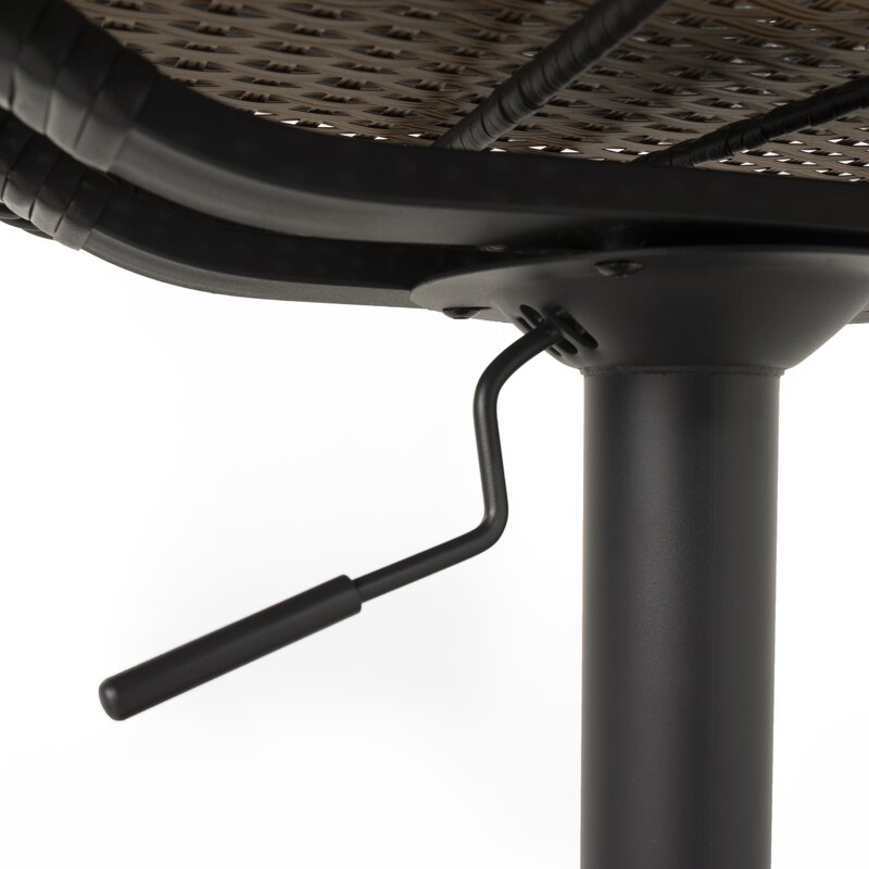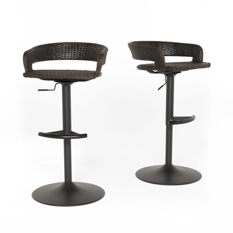This set of two patio bar stools elevates your outdoor style with its classic details. Each stool is made of powder-coated aluminum and resin rattan and features a circular base, a slim body with a built-in footrest, and a low-profile bucket seat with an open lumbar area to keep things cool. We love that these stools swivel and are height adjustable, so you can find just the right position for entertaining. They complete the look in any modern or bohemian setting.