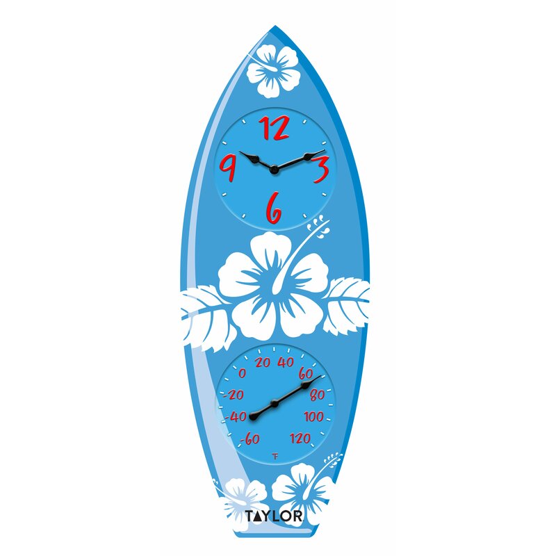 Taylor Precision Products, Surfboard Poly Resin Clock and Thermometer, 14 Inch, Multi-Color