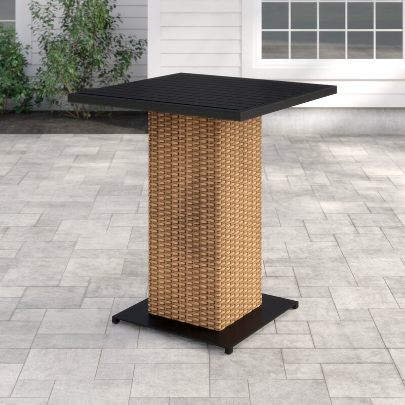 Give your outdoor space a touch of laid-back modern charm – and your guests a place to set down their drinks! – with this essential bar table. Its square frame is crafted from rust-resistant aluminum and wrapped in resin wicker for a look that stands up against inclement conditions as well as too-sunny days. A cast aluminum tabletop mimics the appearance of wood with plank-style detailing as it offers a dash of mixed media appeal.