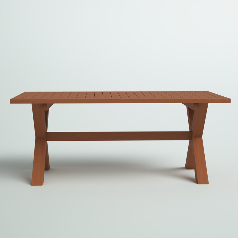 This 6-person patio dining table creates a gathering spot for bubbly drinks and conversation, with plenty of rustic charm. It’s crafted from solid eucalyptus wood in a warm brown hue for a home-y feel. The design features a rectangular table top with a slatted style that’s classic and breezy, resting on a trestle base with X-shaped side accents. We love that this outdoor dining table is resistant to weather and water, so it’s great for year-round use. Plus, it has a built-in umbrella hole.