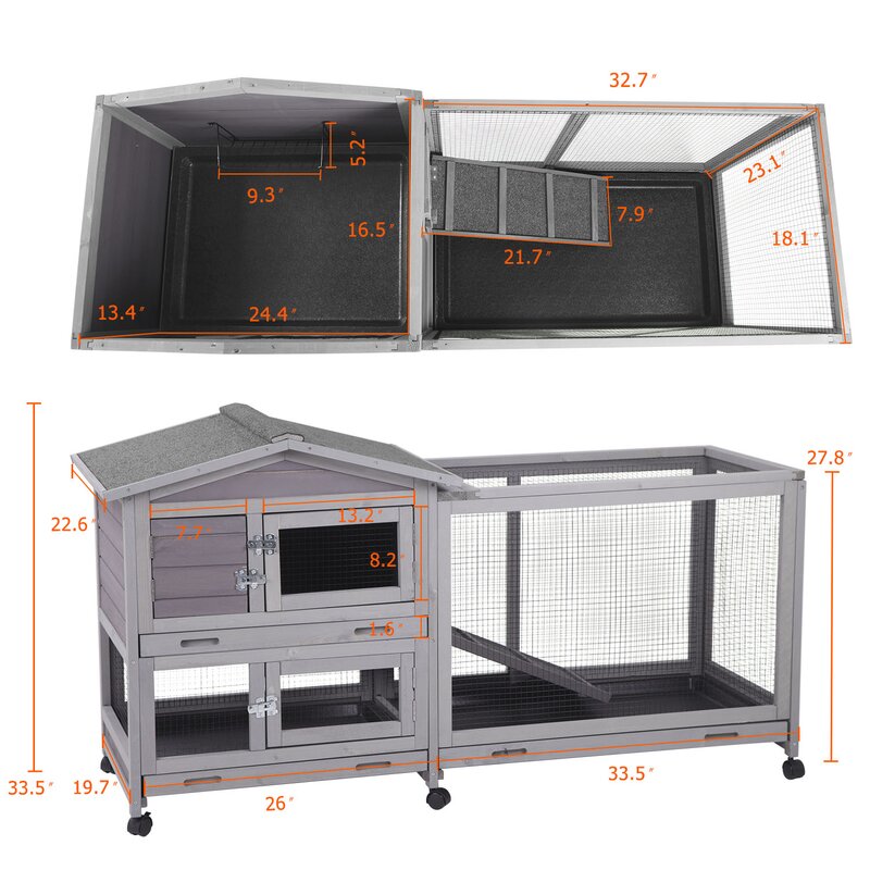 Product dimensions: 61.2″L x 22.6″W x 33.5″H, bunny cage upgrade with 1.8” depth thicker plastic no leak removable pull-out tray from back and front, easy to clean! Never go moldy.