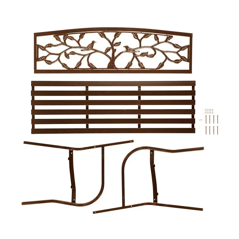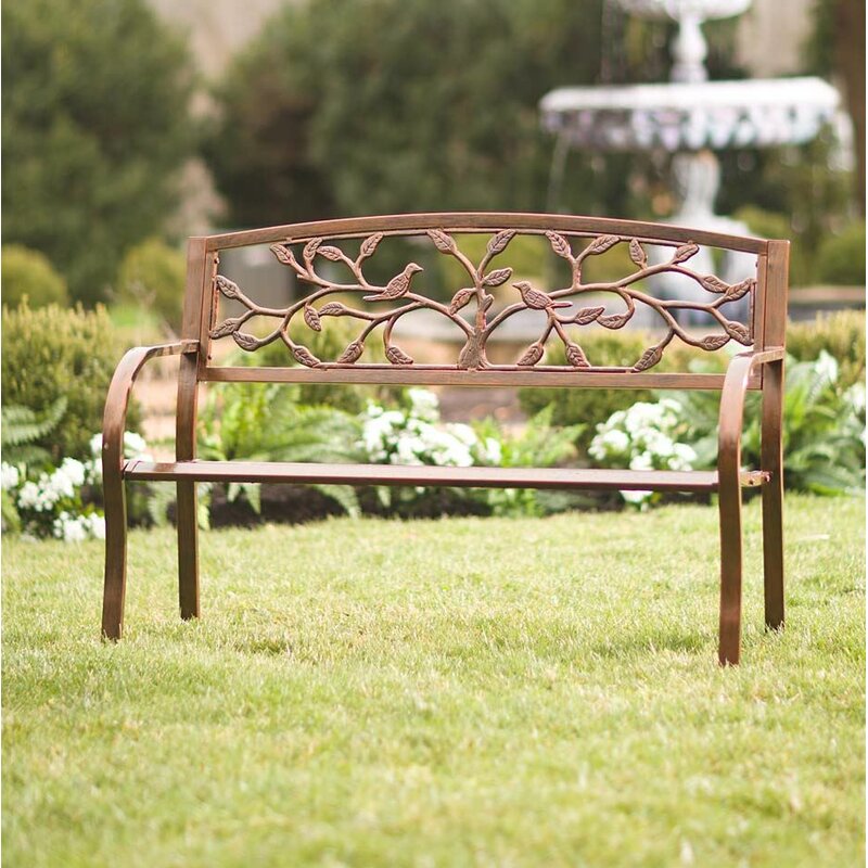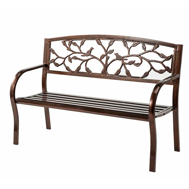 This lovely Tree of Life Iron Garden Bench features a spacious, slat-style seat that makes it a welcome resting place for two. The backrest is decorated with the twisting branches of a tree of life that happens to be hosting a pair of perched birds. A delightful accent for your lawn or patio, this lovely bench is treated with an antiqued copper finish.