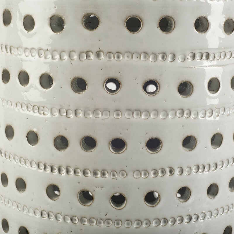 That is an Arista Ceramic Garden Stool decor item that adds that perfect accent to any room. These handmade pieces feature white glazing with tan base designs that are subtle but look amazing.