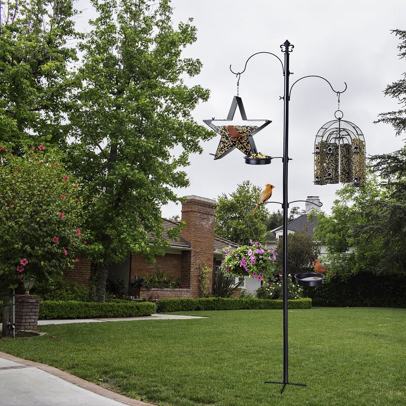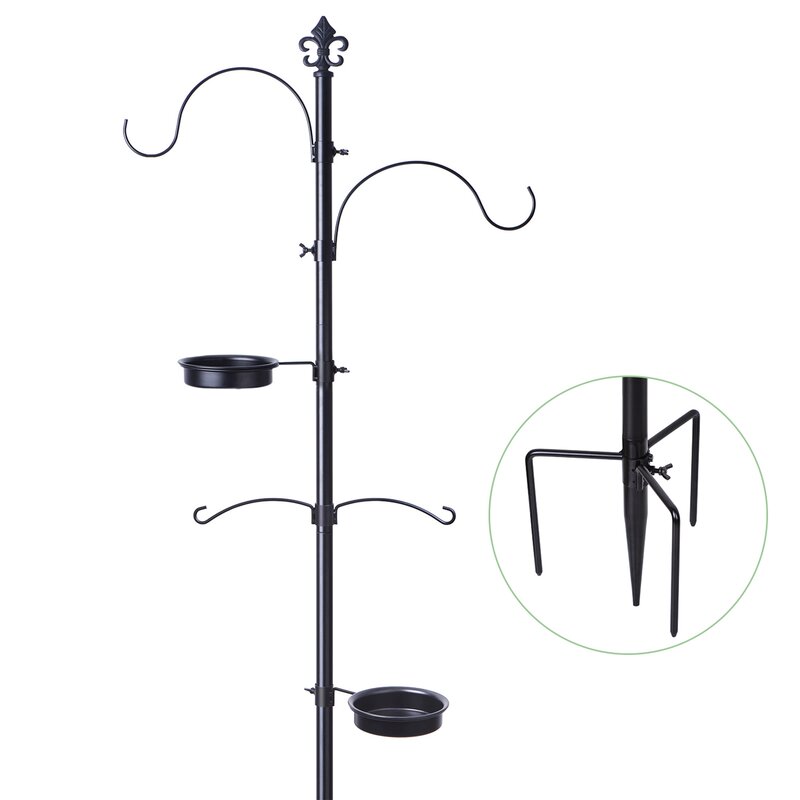 Effective Design – Metal feeding pole comes with twin top level hooks which are ideal for hanging different types of bird feeders, plant, lanterns, wind chimes and decorations. Two additional hooks provides more hanging options. An included metal water bowl functions as a bird bath while the other metal tray with drain holes can hold a wide variety of bird food