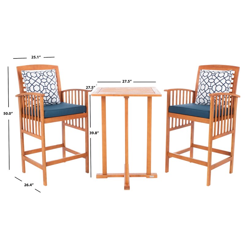 The hottest rooftop bars in Palm Springs inspired this 3 piece bistro set. Crafted in a sleek wood finish, its contemporary bar-height table and matching chairs with upholstery and pillows lend instant style to any outdoor terrace or entertaining area.
